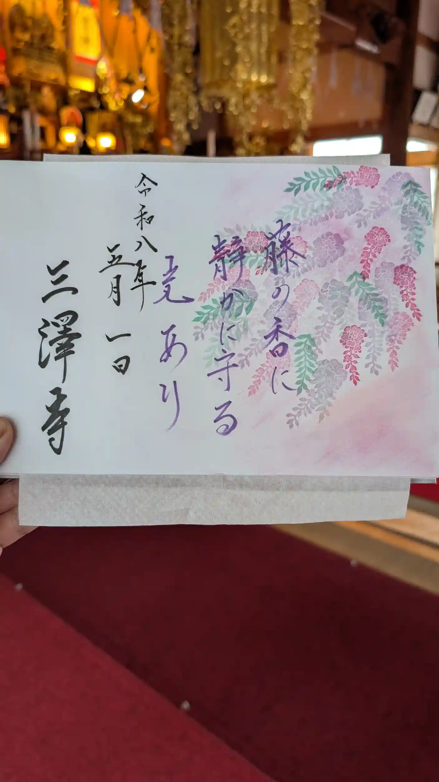 幻想的な藤をあしらった御朱印です。藤の香りをつけた墨で記帳することで御朱印帳から藤の香りが楽しめます。