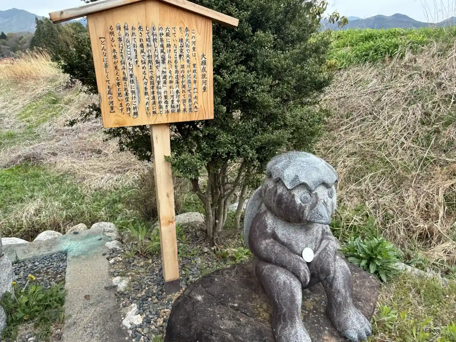 天竜川に向かって立つ小さな神社で、周辺にはかっぱの伝説がありました。