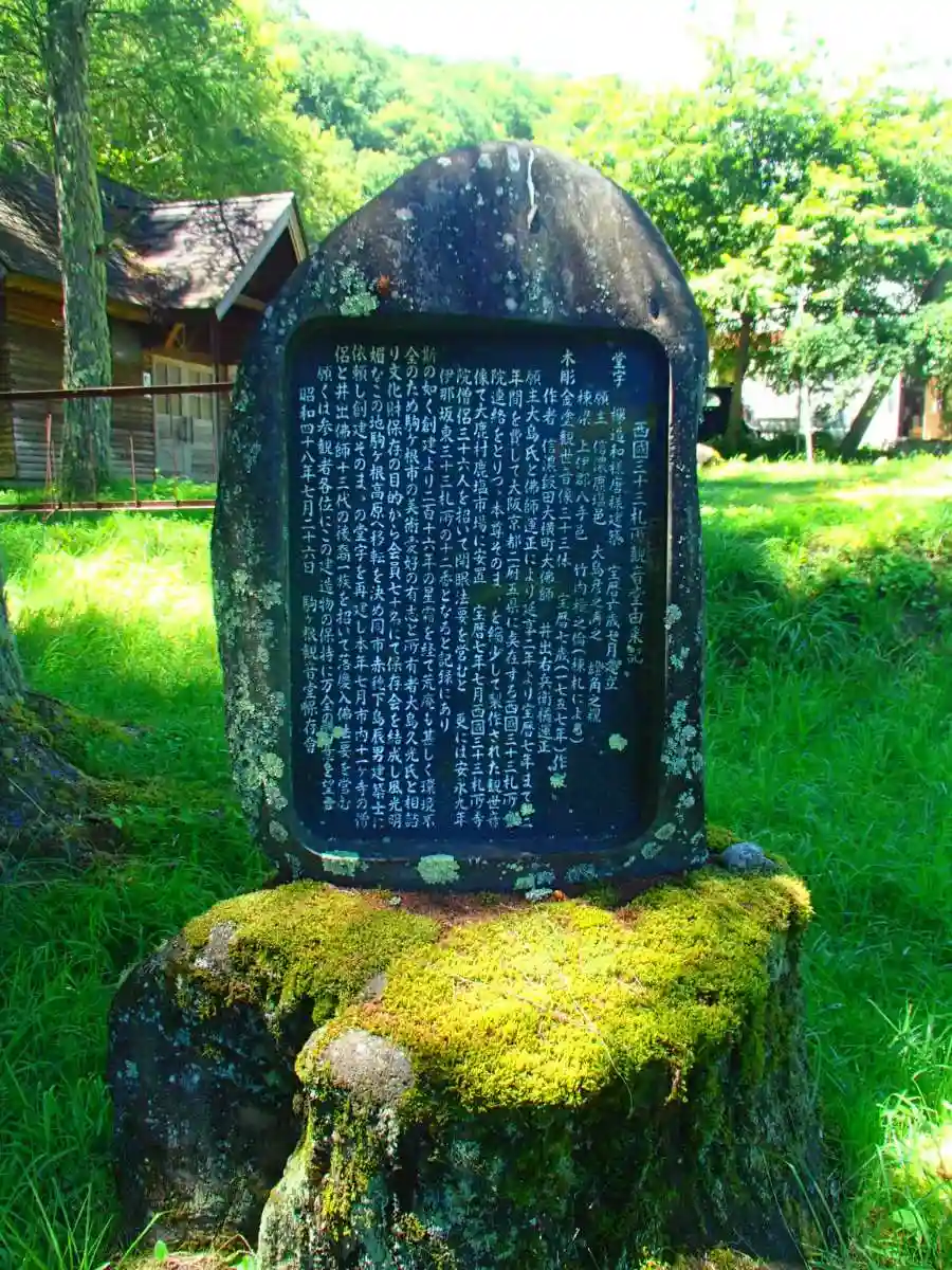 願主大島氏と佛師運正により、延享二年より宝歴七年まで十二年間を費やして大阪京都二府五県に点在する西国三十三札所寺院連絡とりつつ、本尊そのままを縮小して製作された観世音像で大鹿村鹿塩市場に安置