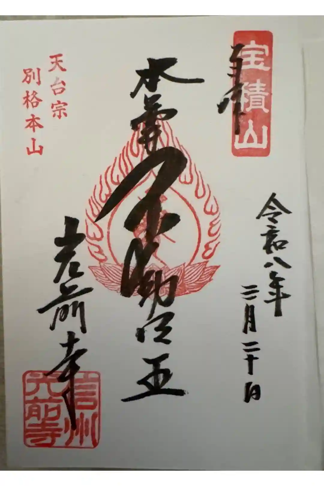 真ん中に不動明王と書かれ、右上に宝積山の印、真ん中に梵字の印、左上に天台宗別格本山の印、左下に信州光前寺の印が押されています。