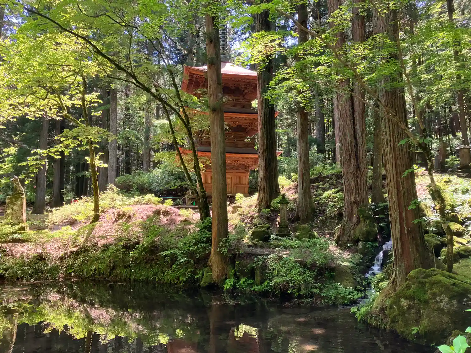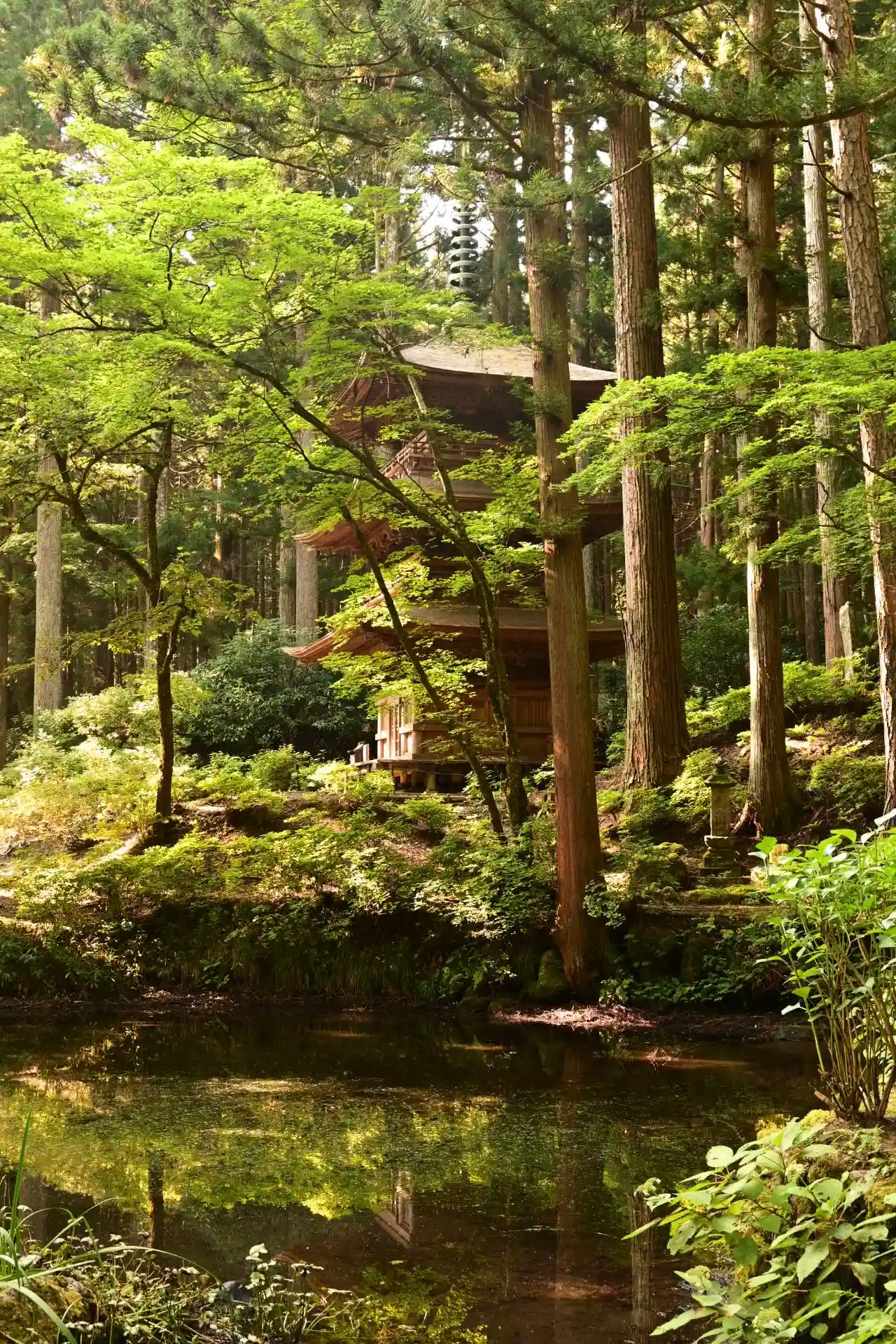 左には三重塔、手前には池があります。