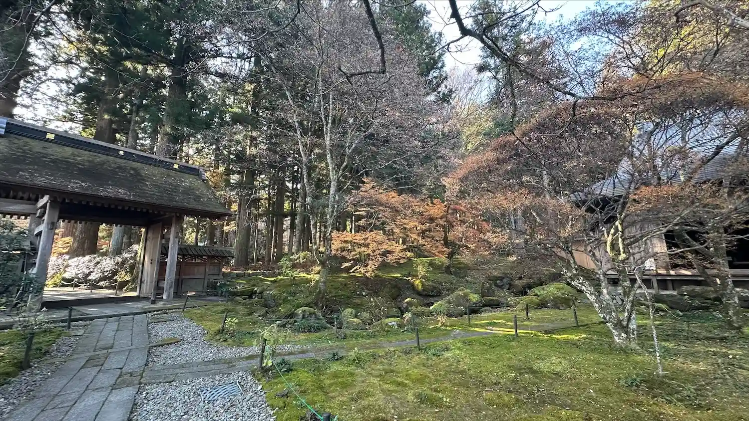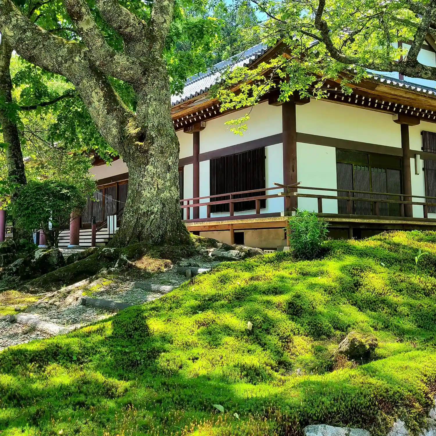 仁王門から三門までの参道石積に光苔が見られるようですが、乾燥した日が続いているせいか確認できませんでした。御朱印を頂いた時に尋ねてみると、本坊の縁の下で見られるようなので、別途、本坊庭園の拝観をしました。