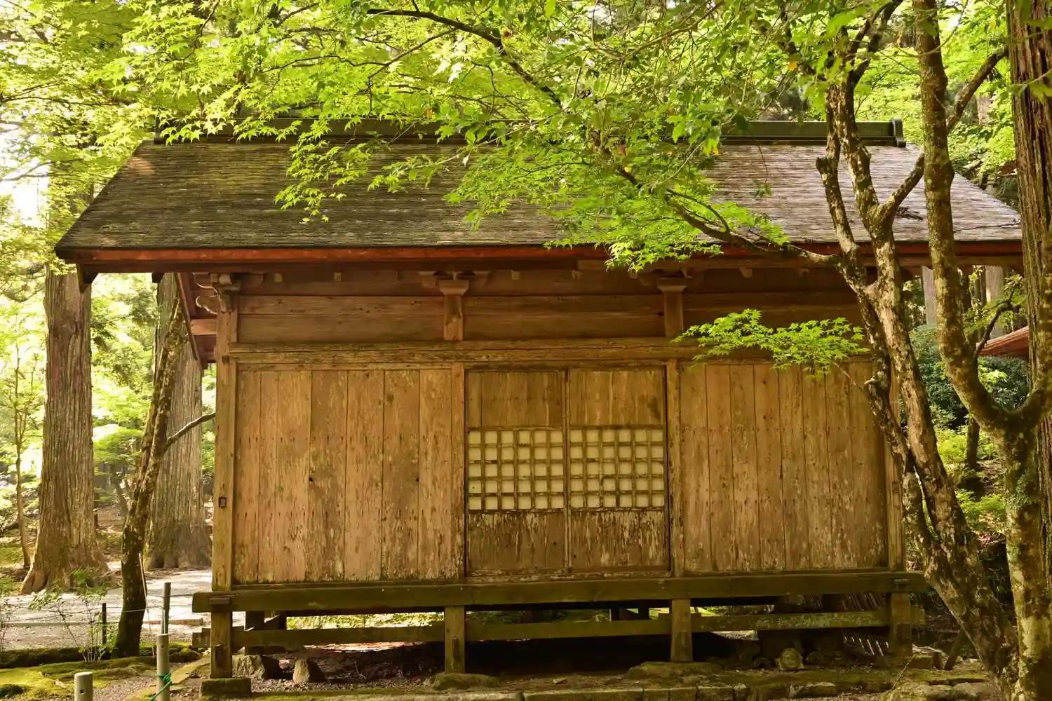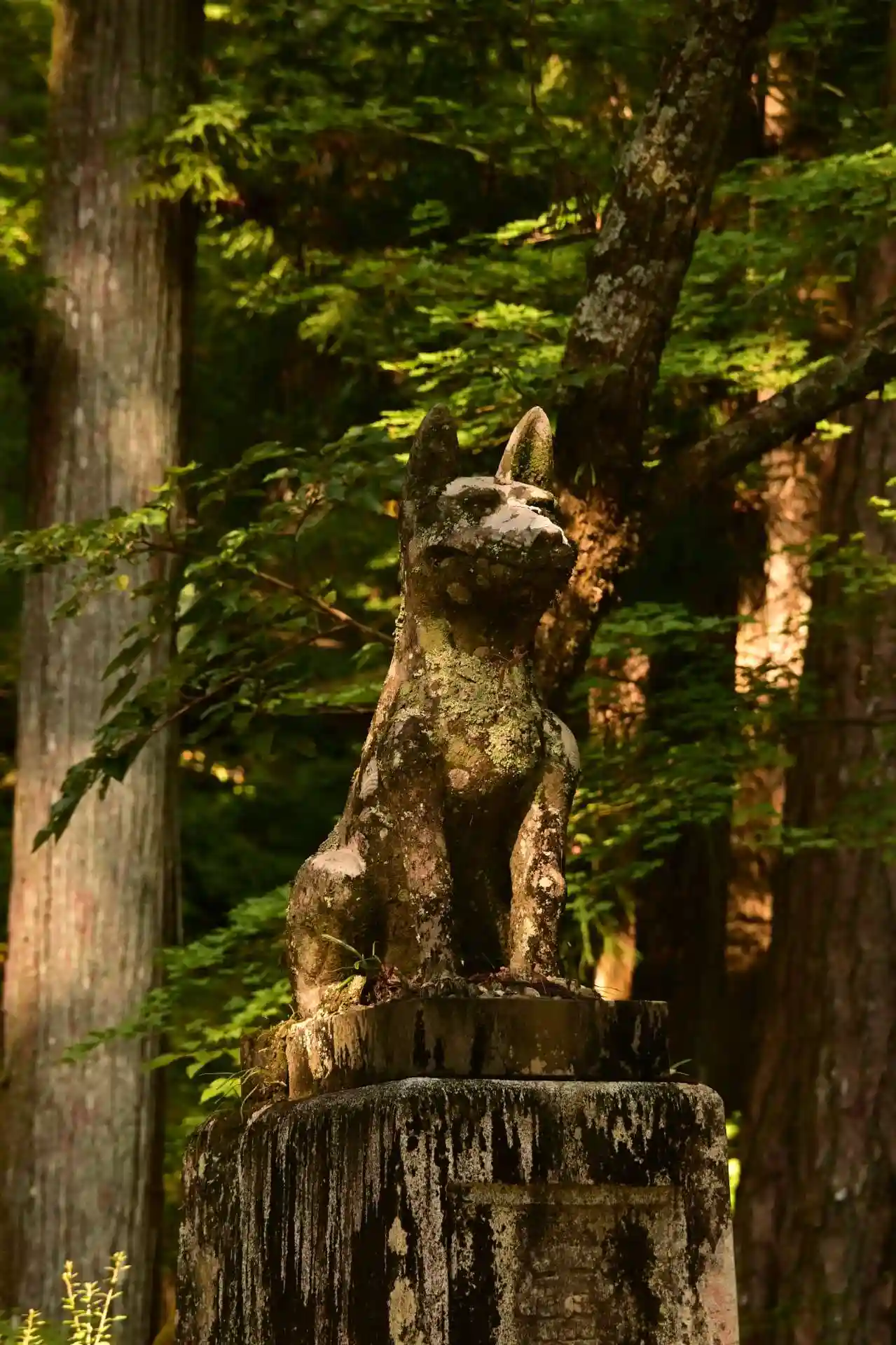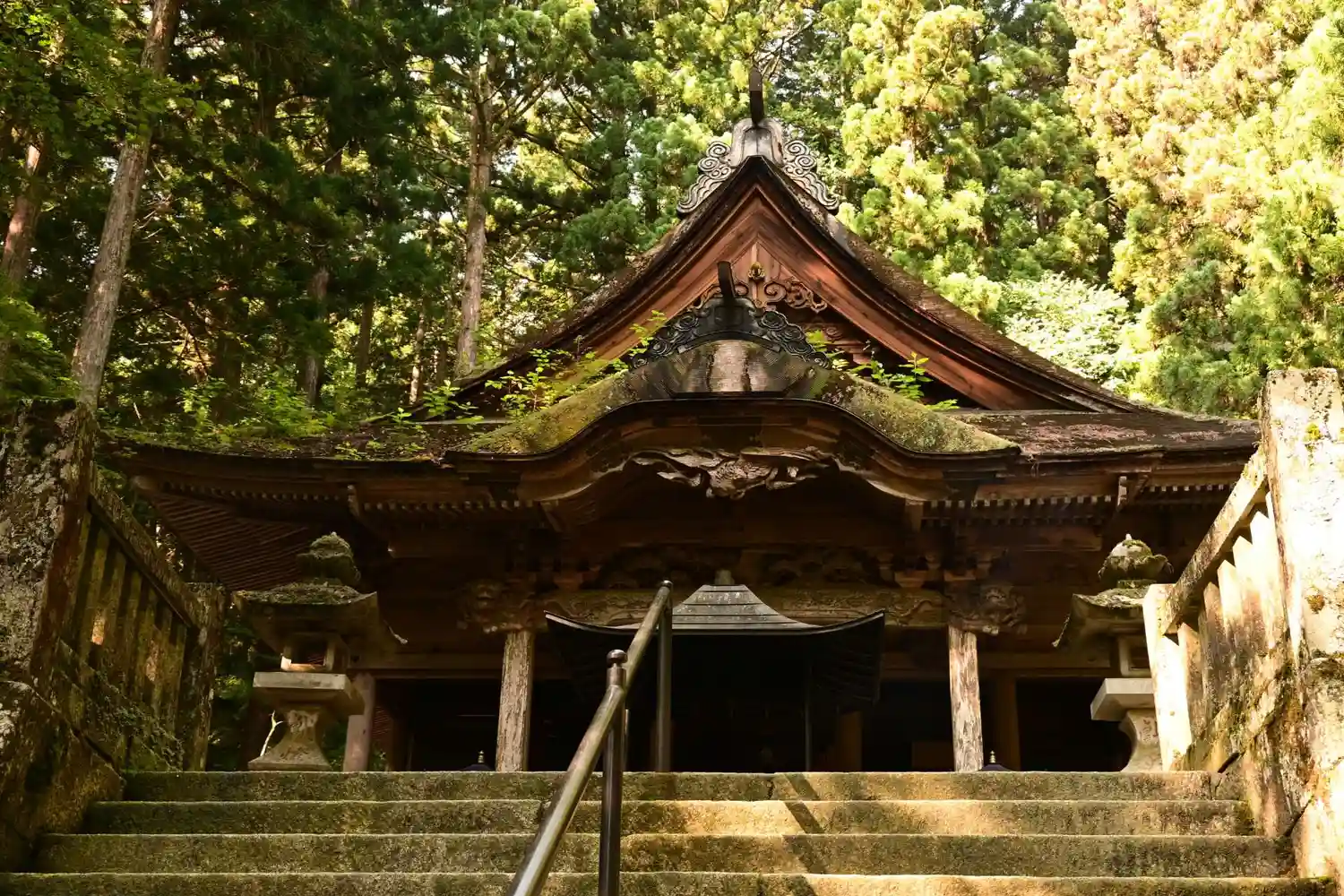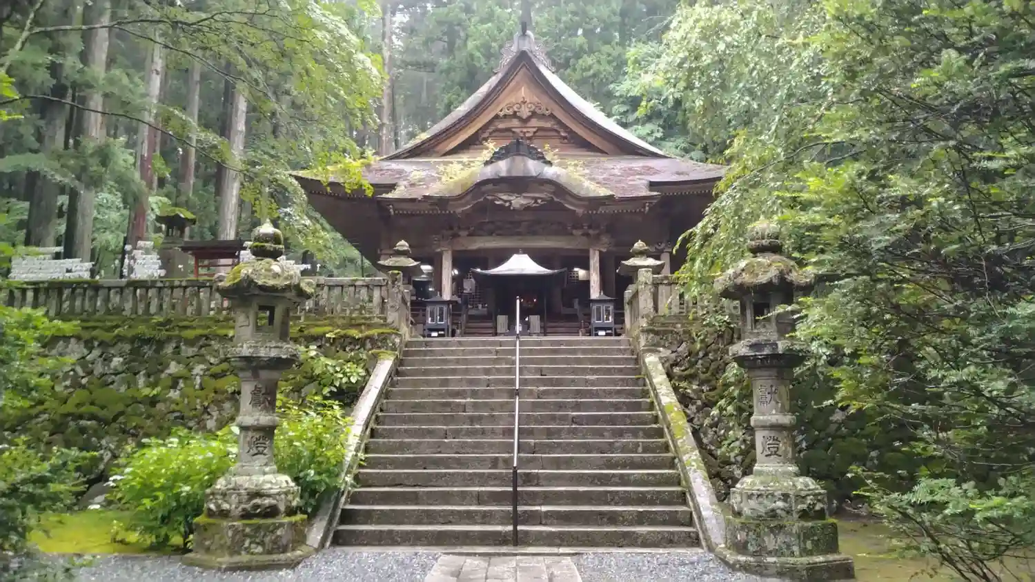 霊犬早太郎伝説でも知られ、参道脇の石垣には珍しい光苔が自生しています。
