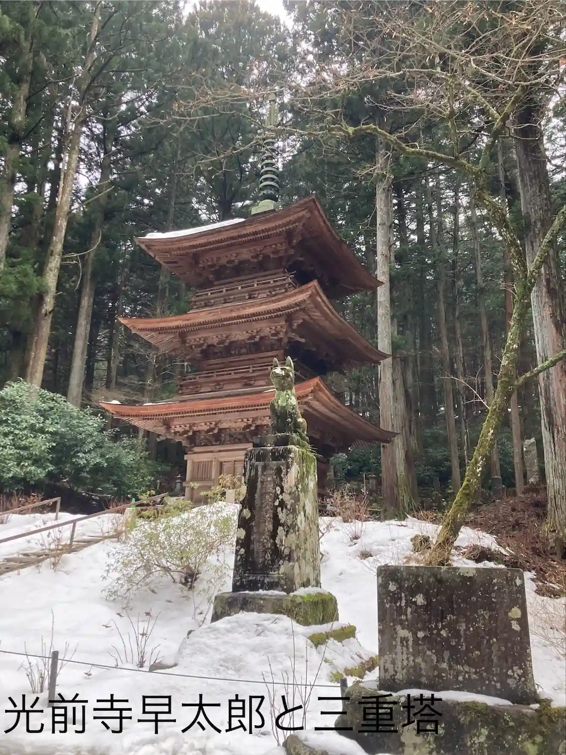 三重塔と早太郎の像