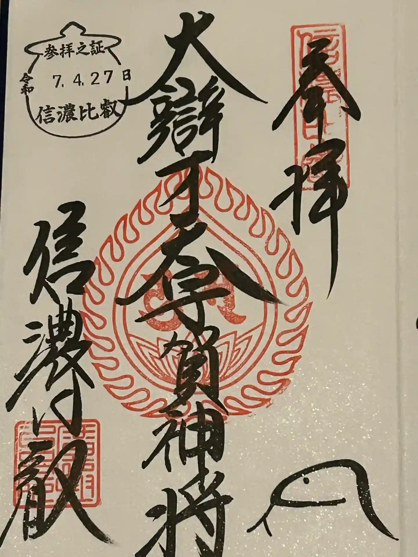 南信方面に出かけた帰りに参拝しました。当日はお休みでしたが、幸いにも無人の書置き御朱印がありました…
