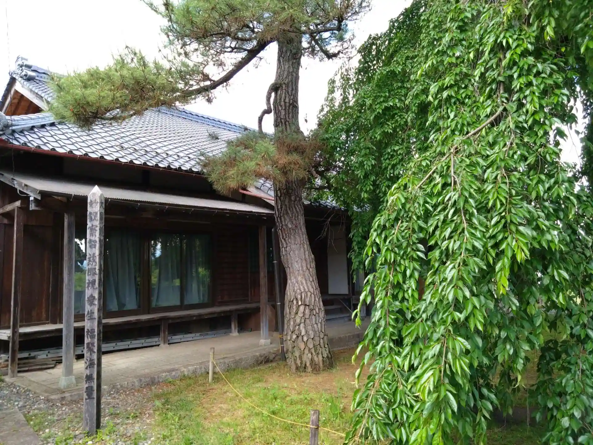 山門と比べてもその巨大さがよくわかる樹齢300年のシダレザクラがあります。満開の時を見てみたい気がします。