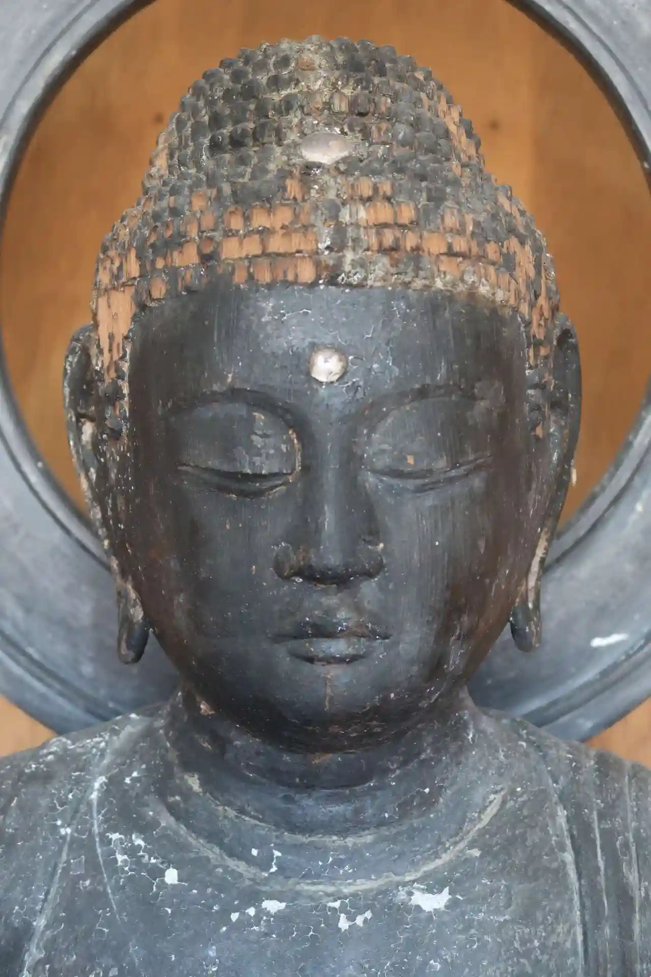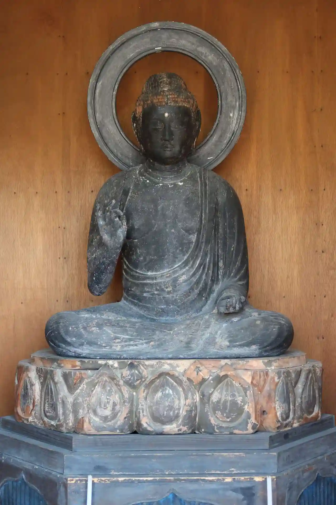 右側へ進むと阿弥陀堂、保存会の方に扉の鍵を開けて頂きました。堂内には阿弥陀如来坐像があるのみ、高さ約85cm、割矧造、彫眼、丸顔で目鼻口が小ぶりで若々しい。膝はそれ程厚くなく、衣紋の彫りは浅目。中央で学んだ後の地方仏で、平安時代末期の作と考えられています。