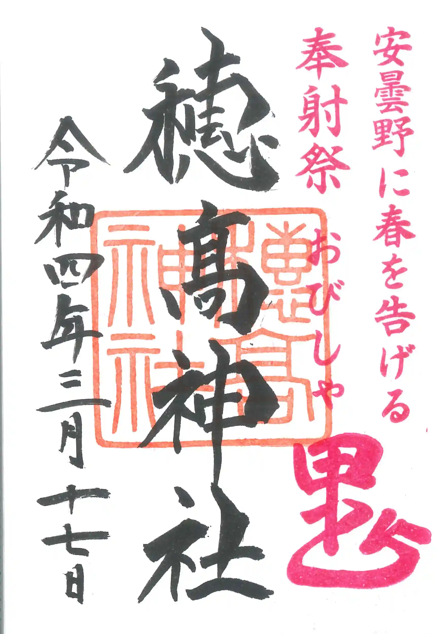 年に一度の奉射祭を奉祝し、3月17日に奉射祭限定朱印を頒布致します。