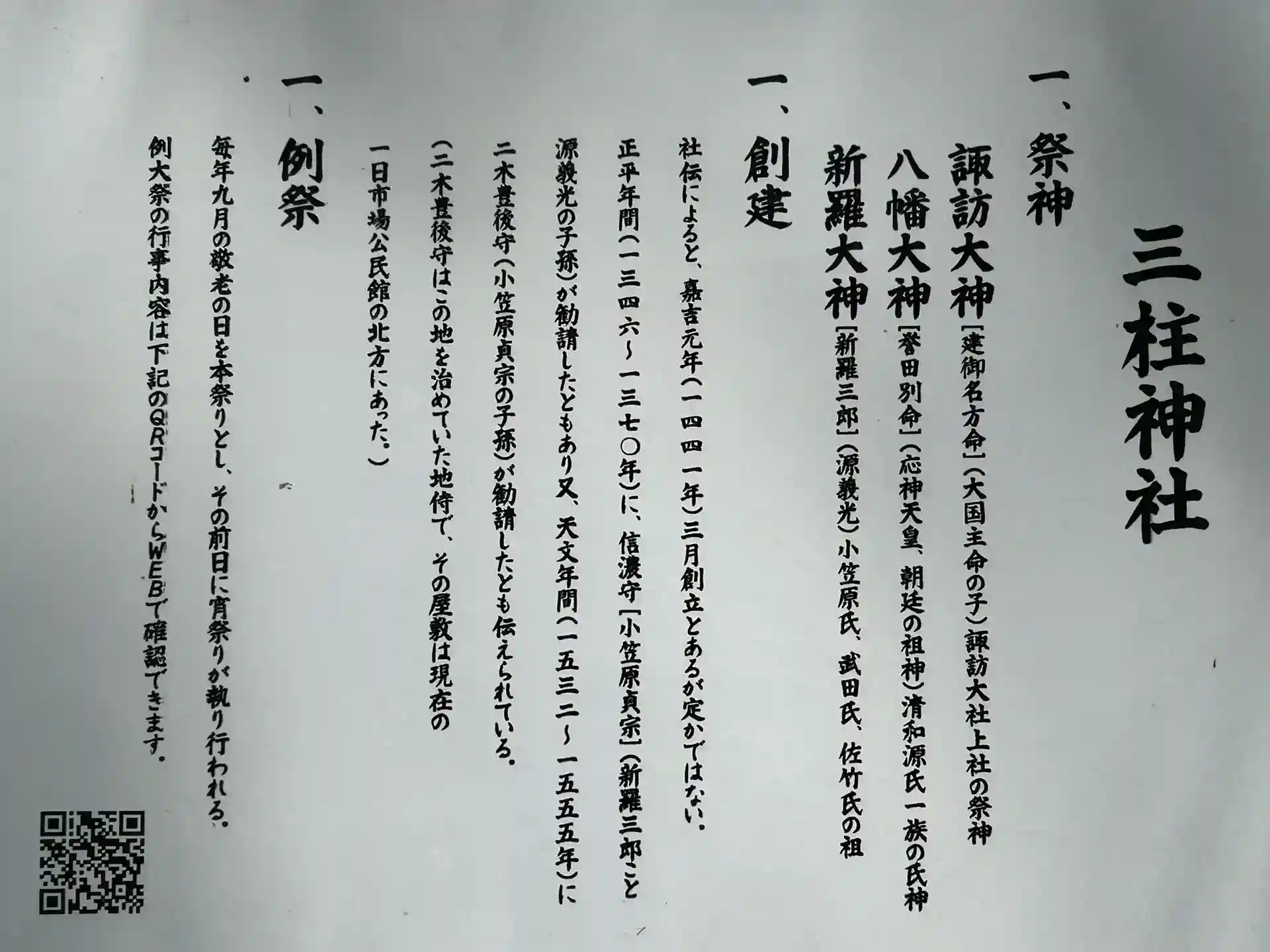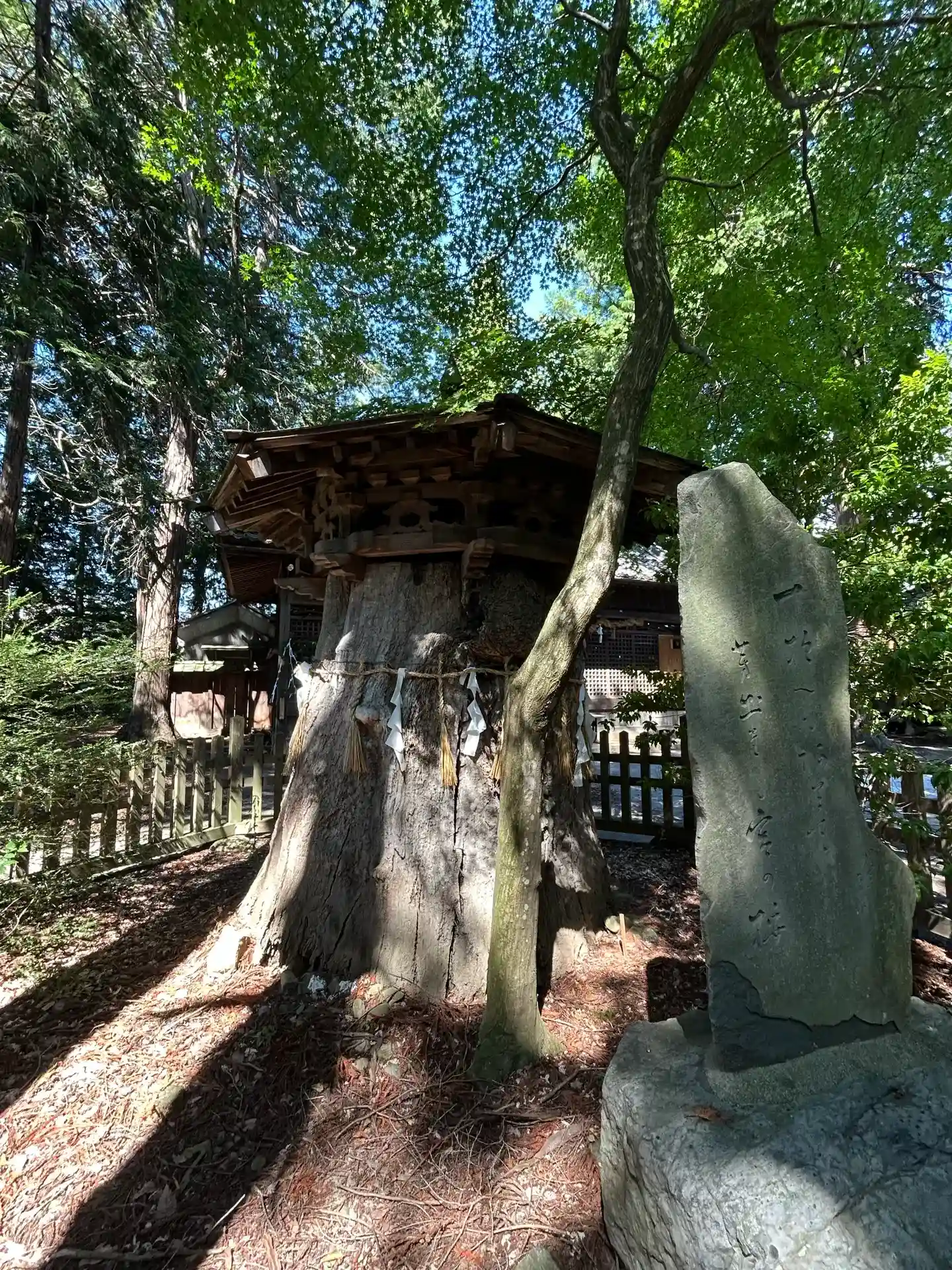 田舎の小さな神社なんですが、三柱の一柱新羅三郎「足柄山秘曲伝授」像が祀られ、樹齢七百年の「はりぎり」の神木が落雷か何かで幹のみ残っていますが、腐敗を防ぐ屋根が木木組みの立派なものが置かれています。