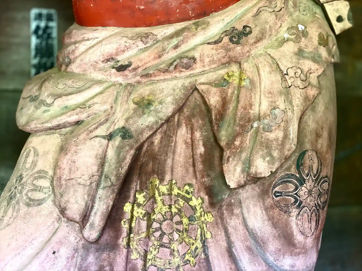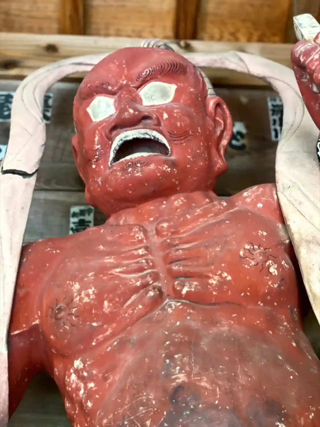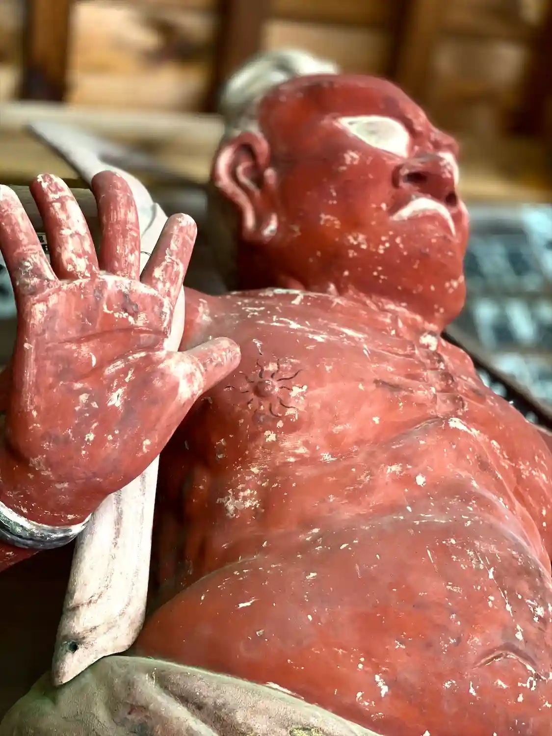古いお寺に新しい?手作り感のある木彫りの仏像、なんとも愛嬌のあるお顔をされています😊