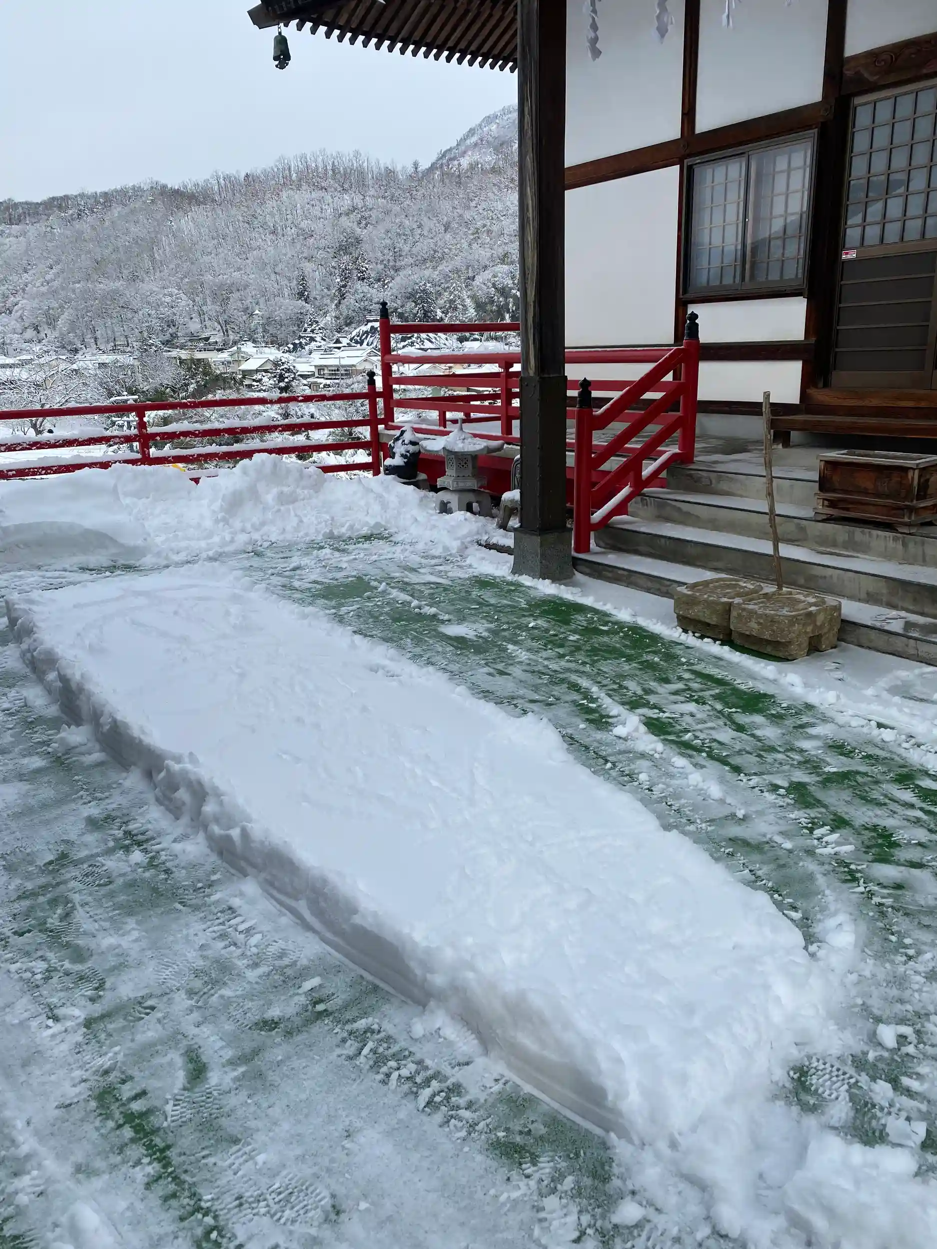 途中、雪かきをしていた本堂前がなんとなく書道半紙に見えたので持っていた雪かきを裏返しお題目を書いていました。