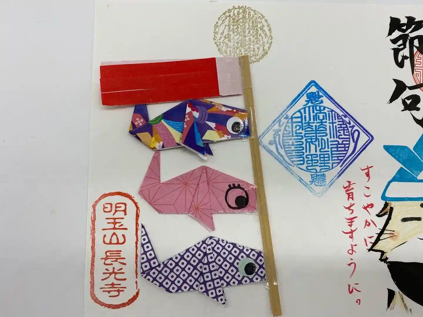 こちらの御首題には折り紙で作成した鯉のぼりを貼り付けております。