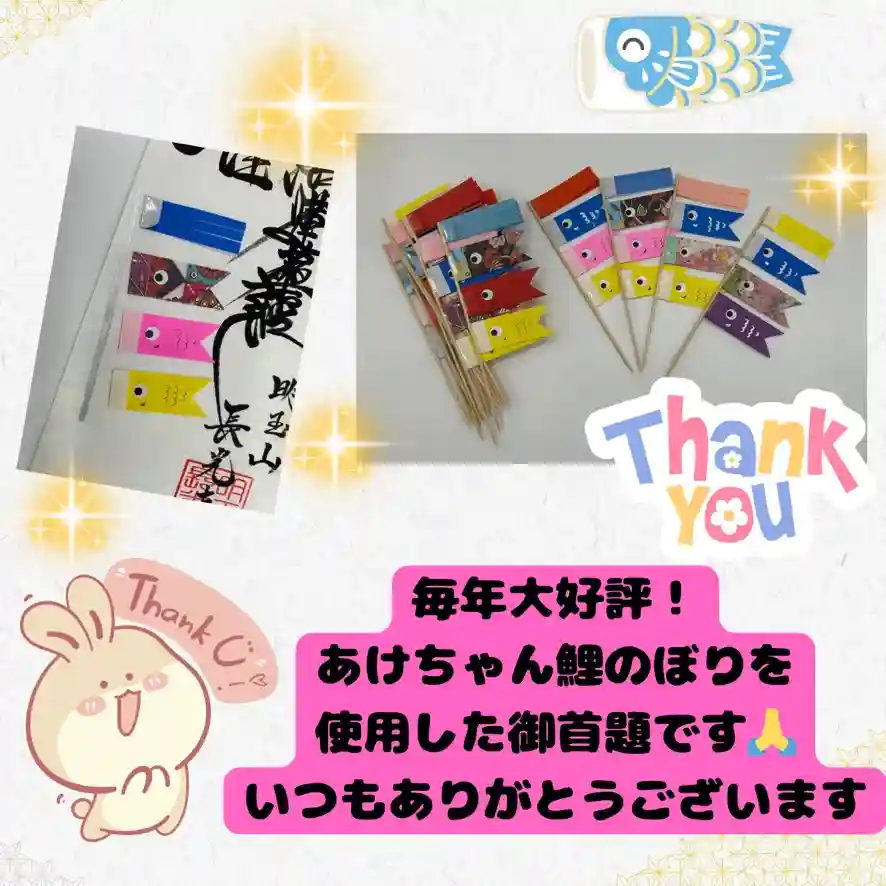 みょうぎょくさまが笑顔で菖蒲湯に入っているほっこりイラストと、こいのぼりと菖蒲の花が季節を彩ります。