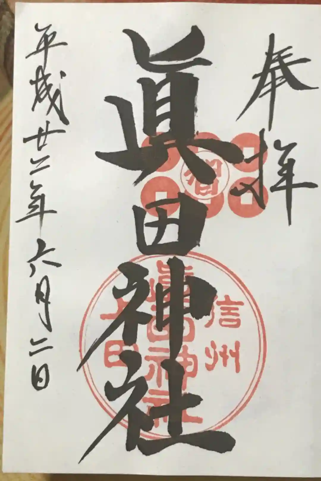 昨年参拝した眞田神社の御朱印。右上にある六文銭の印の文字がいただく日によって変わるそうです。