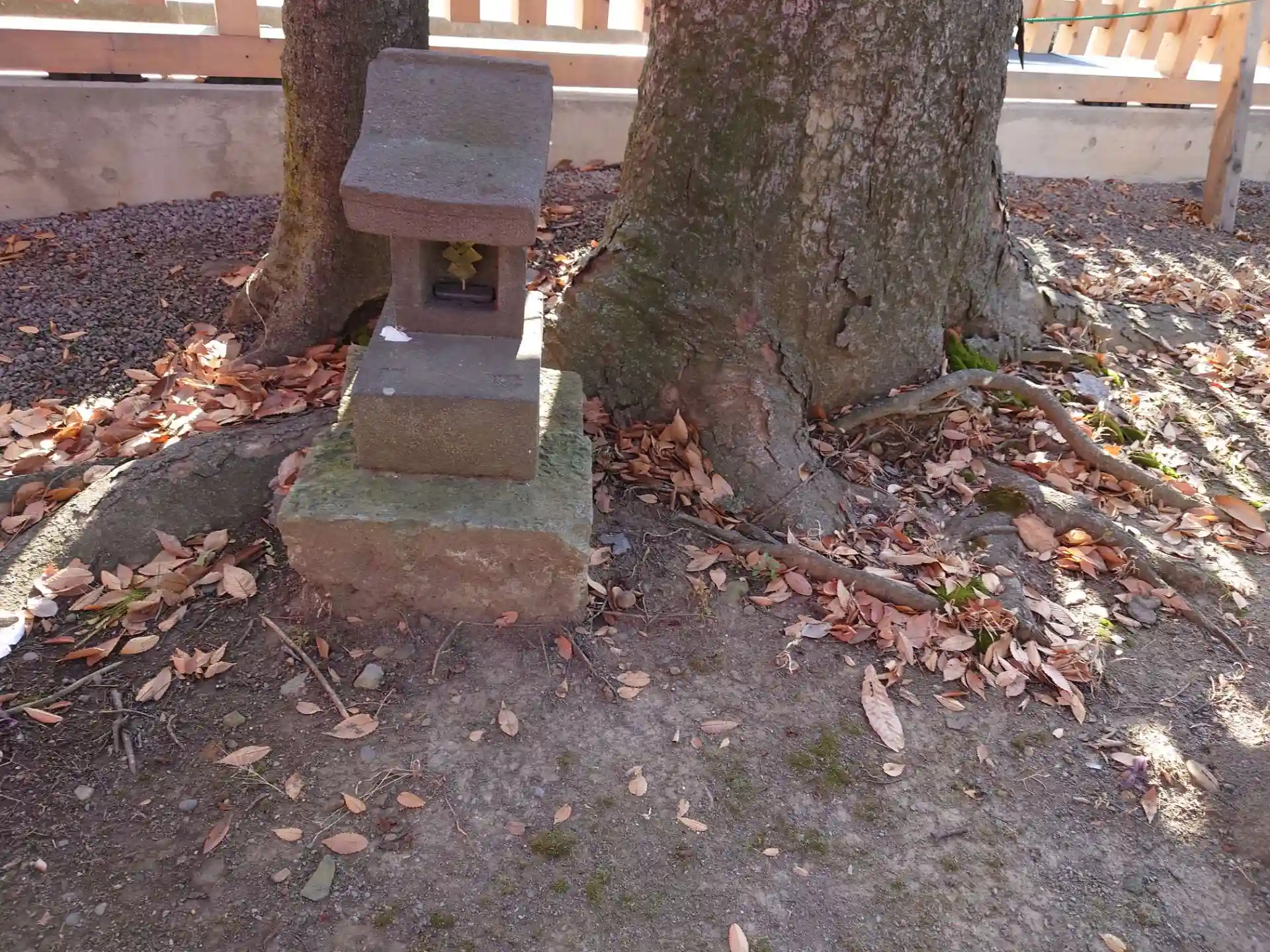 御神木の下に石祠(産霊神むすびのかみ)