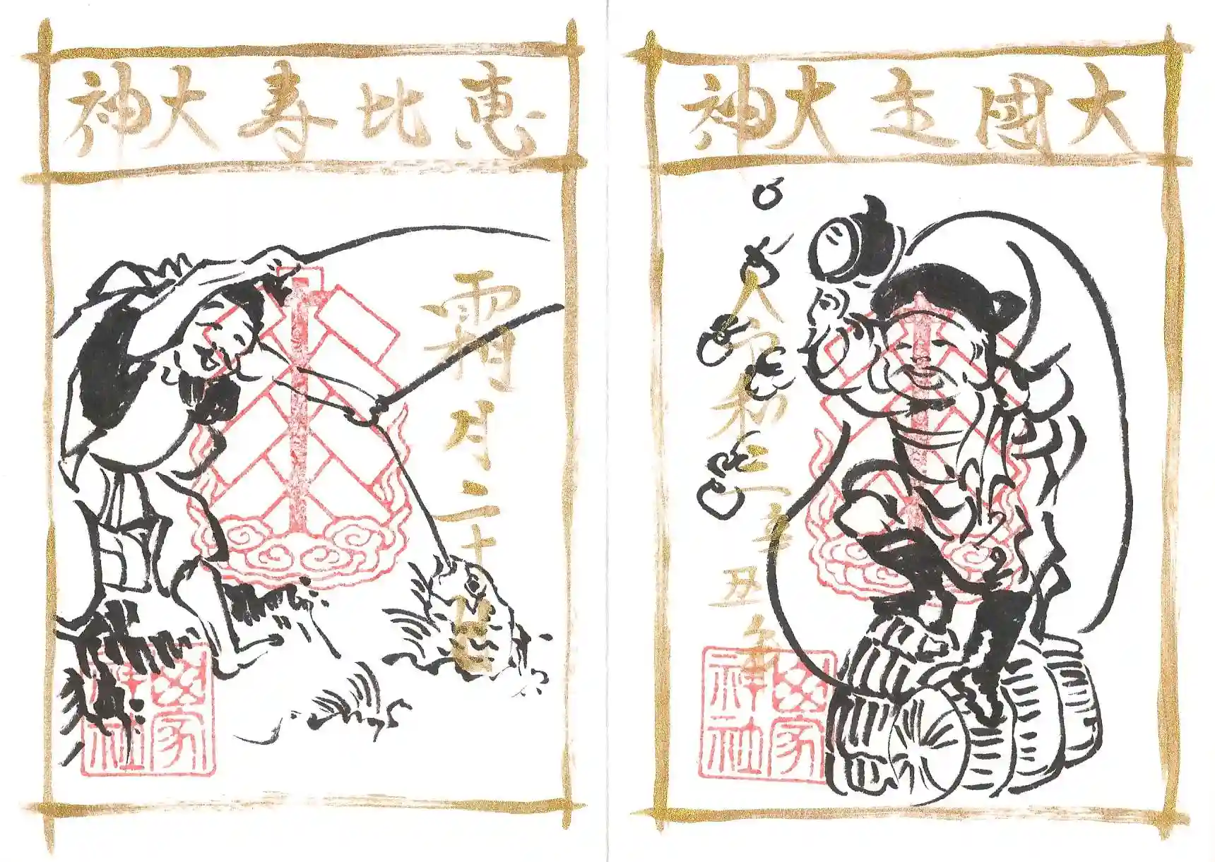 御朱印は御朱印帳を宮司さんにお預けして、後日書いていただきました。右側が大黒様、左側が恵比寿様で、見開きではなくてそれぞれ一つの御朱印だそうなのですが、実質見開きっぽい感じですかね。