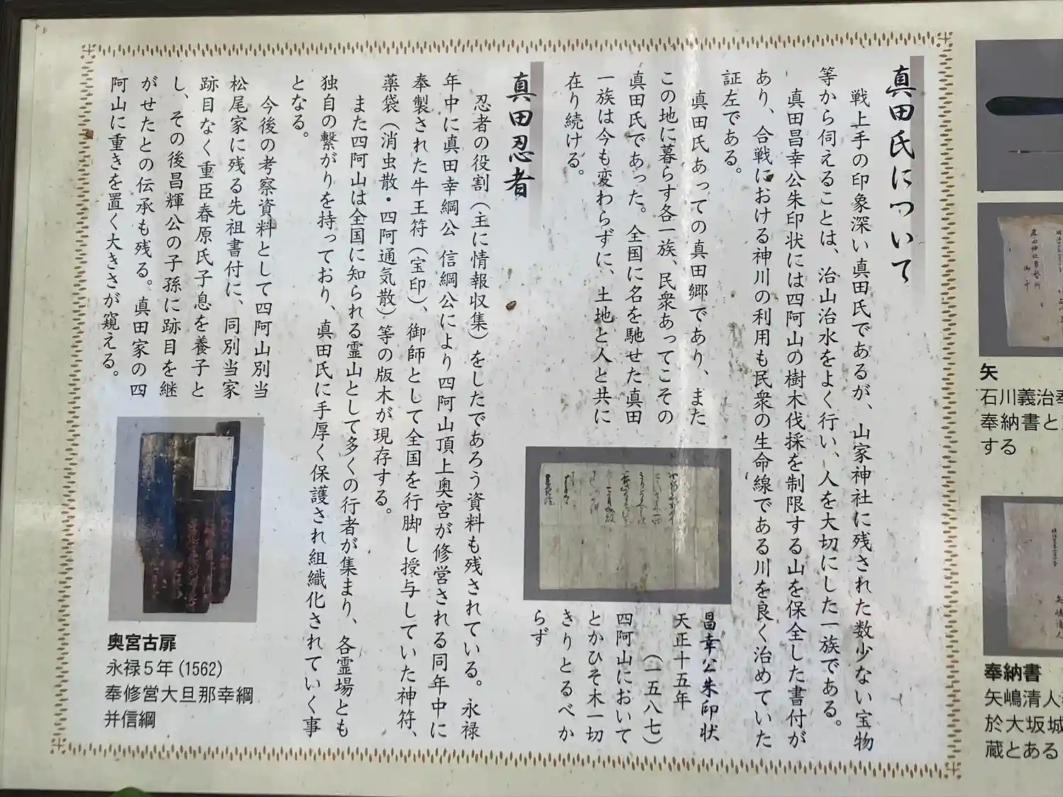 山家神社は農業、水利、疫病、盗難、その他諸々の災厄、祈雨、祈晴に霊験あらたかな為、古来、国司、守護職、武門、武将より一般民衆に至るまで、 崇敬極めて厚く、その信仰は長野県下はもとより、埼玉、群馬、遠くは兵庫県にまで及んでいた。特に真田氏代々の崇敬深く、奥宮(四阿山)並びに本宮の営繕や寄進を受けている。 慶長五年(1600)九月兵火にかかり全焼し、翌六年に真田信幸公が再建した。