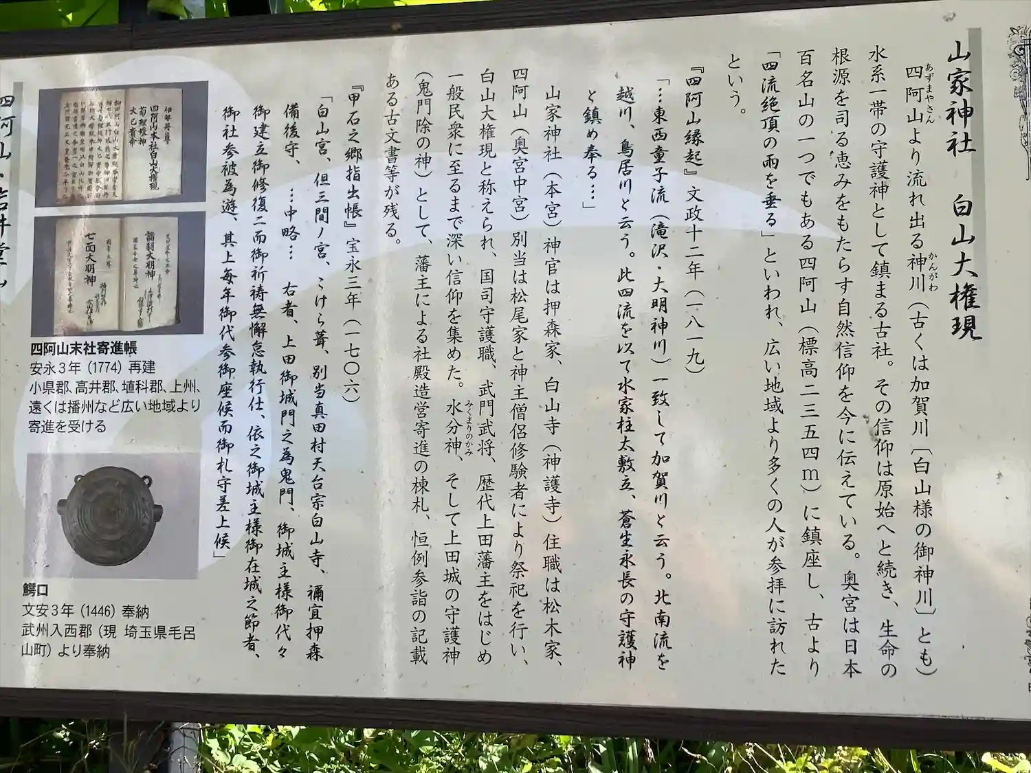 延喜式神名帳にその名の見える「山家神社」は、信濃國は小県郡の山間部に位置する古社であり、 その御神体である四阿山あずまやさんより見晴かす神川水域一帯の大産土神として広い信仰を受けてきました。