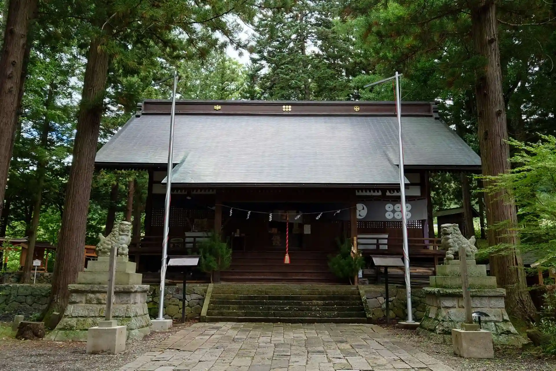 真田神社様より向かいました。鳥居の左側に車は止められます。他に1台ありドライバーの男性とすれ違いました。国道から少し入りますが木々に囲まれ静かな雰囲気の境内です。雨上がりで少し散らかった階段を上がると本殿が見えてきます。