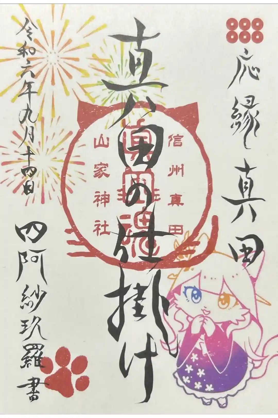 真ん中に山家神社と書かれ、右上に六文銭の紋と信州真田の文字の印、真ん中に延喜式内山家神社と社印が押されています。
