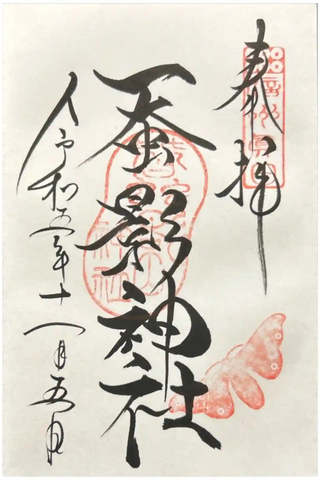 中央に蚕影神社の神社印が、右上には蚕の印が押された御朱印です。