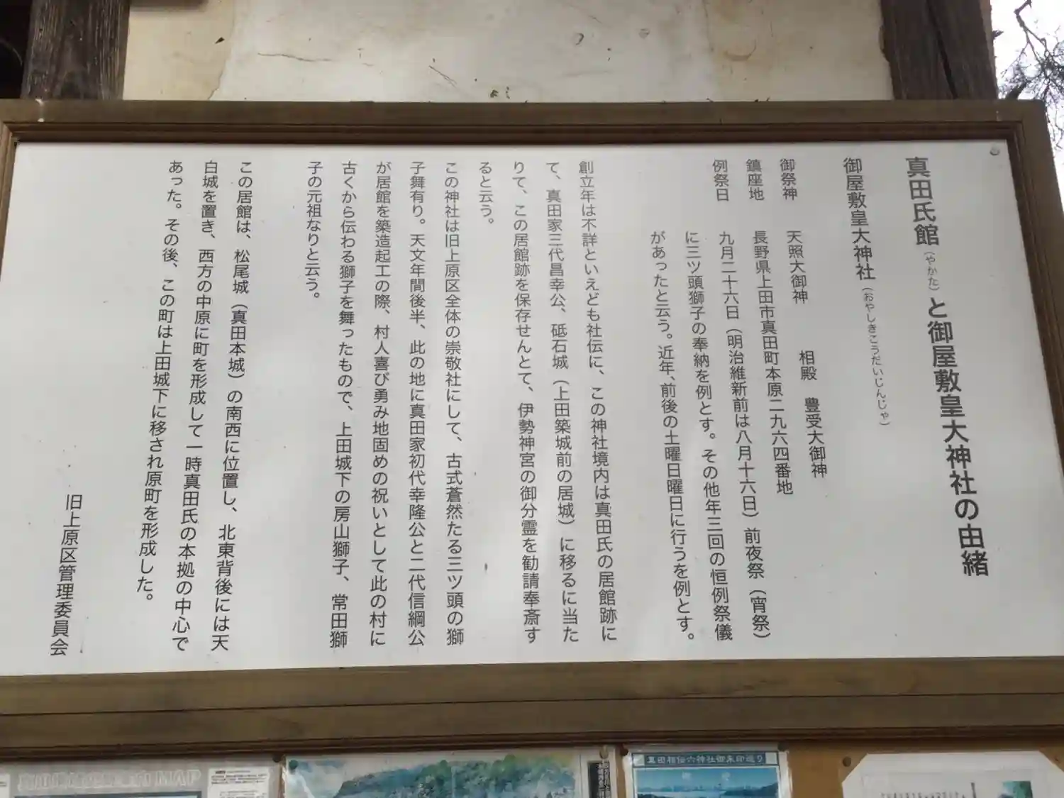| ご由緒 | 神社境内は、県史跡に指定されている真田氏の居館跡で、中世の居館跡としての形態がほぼ完全に残っています。社伝によると真田昌幸が上田城に移るにあたって、この居館跡を保存するため伊勢神宮の御分霊をうつし祀ったと伝えられます。