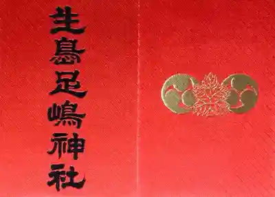 真ん中に生島足島神社と書かれ、右上に大八州真中の印、三つ巴紋の印、梶の紋、六文銭の紋の印が押されています。