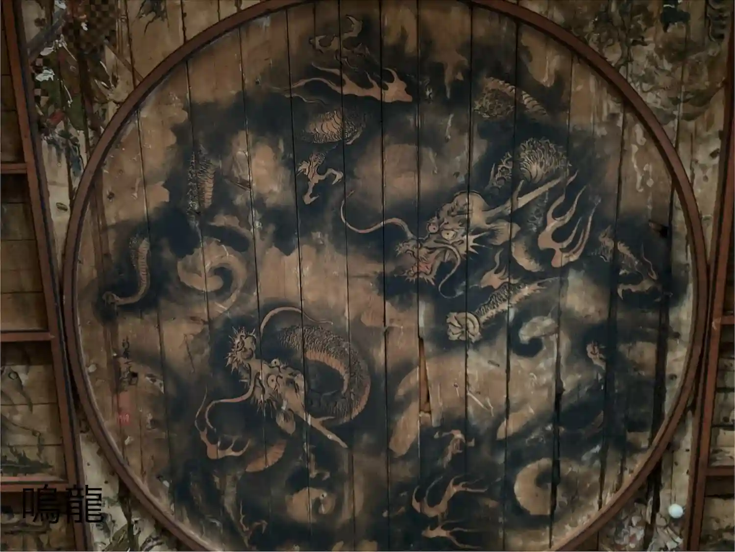妙見寺移転・本堂大改修の際、本堂外陣の大天井に竜の絵が組み込まれました。これは当時の日本画壇最大の画派といわれた狩野派の秀山信尹(しゅうざんのぶただ)の筆によるもので、畳10畳分の大きさがあります。上下2頭の竜が迫力ある筆致で描かれており、その竜の頭の下で手を打つと、「キルルルル〜」といった鳴き声のような音が聞こえることから「鳴竜」といわれます。
