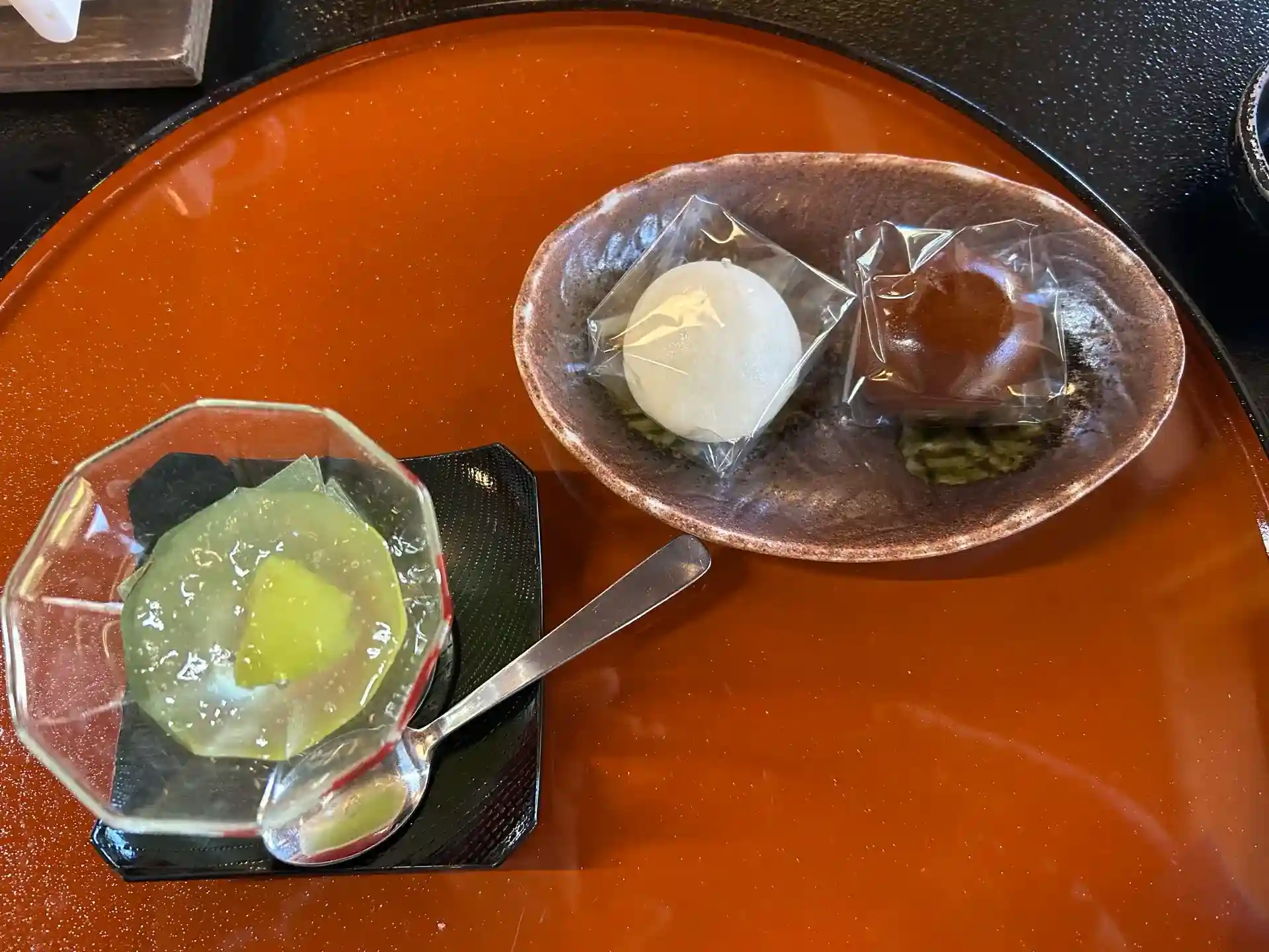 デザート(シャインマスカットゼリーと求肥の笹包み)と饅頭