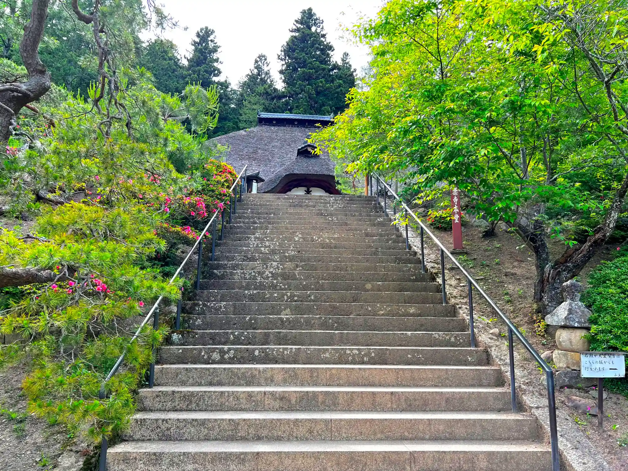 階段を登り切ったところからの眺め。突き当りは<本堂>。江戸時代中期1730年代の再建で、寄棟造、茅葺、正面中央に唐破風の向拝付。