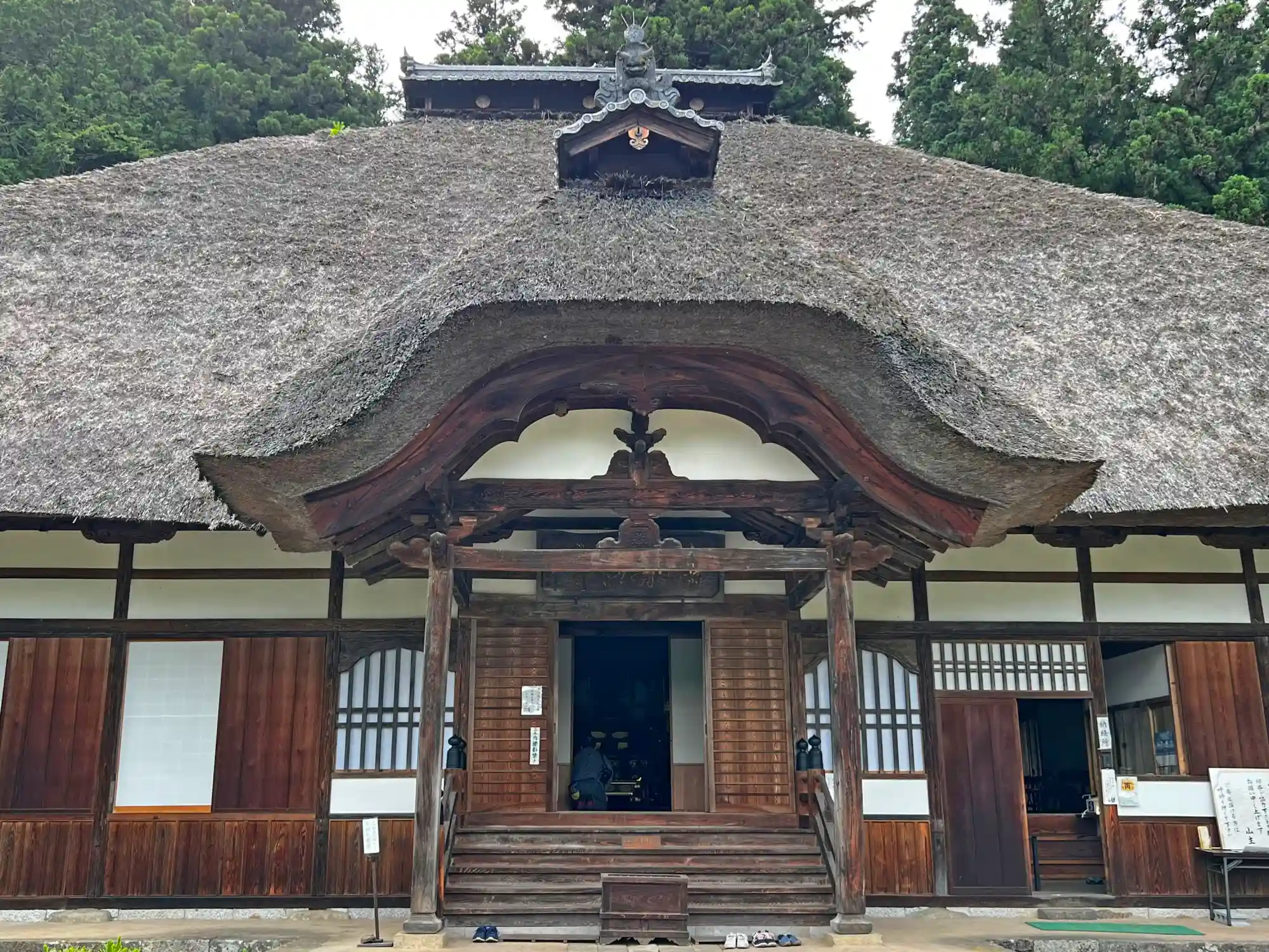 本堂を後ろから見たところ。茅葺屋根の雰囲気が古刹らしくて良い。