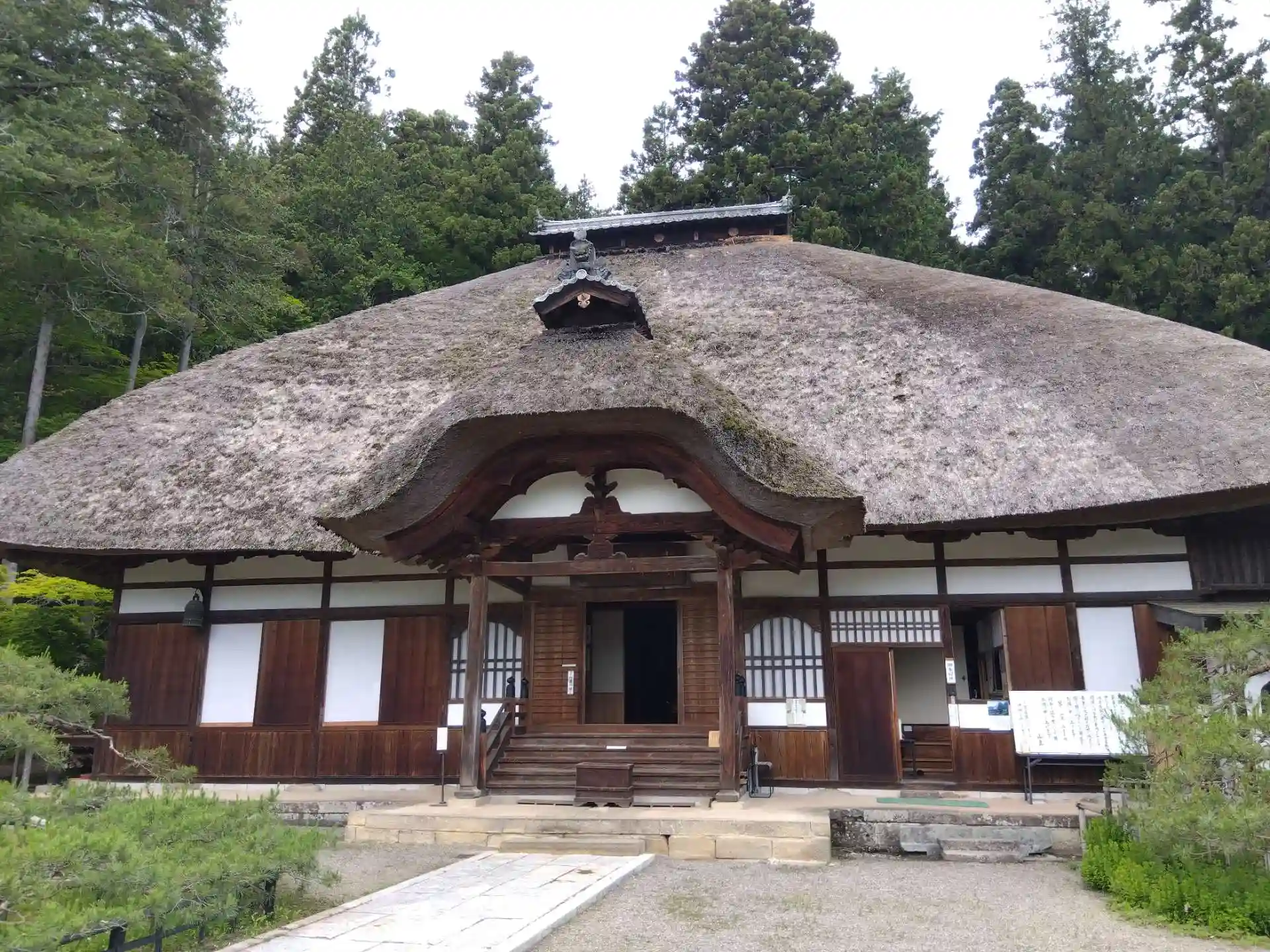 本堂は寄棟造、茅葺きで、江戸時代中期以降の建物。