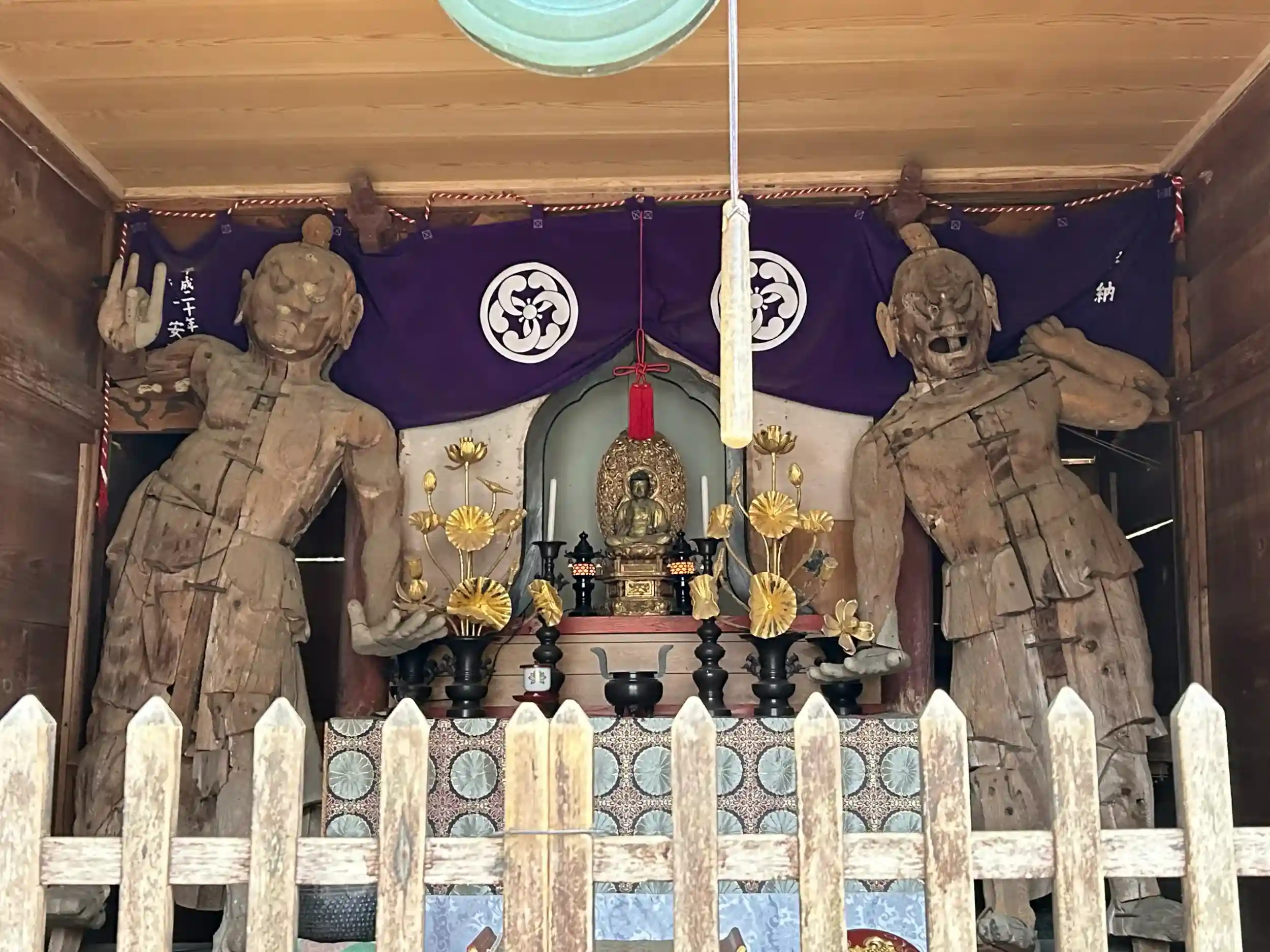 行基の弟子園行が創立したものと伝えられています。現在は天竜寺(曹洞宗)に属しています。はじめは正面・側面とも、柱4本の正方形の建物であったが後に背後に下屋庇をつけ、現在は側面の柱は5本になっています。屋根は銅板葺(元はこけら葺)入母屋造で、正面中央の向拝付近や周囲の欄間などに多くの彫刻が施されており、柱・組物などには派手に色がぬられ、天井には絵が描かれるなど、江戸中期の特色をよく現す建物です。