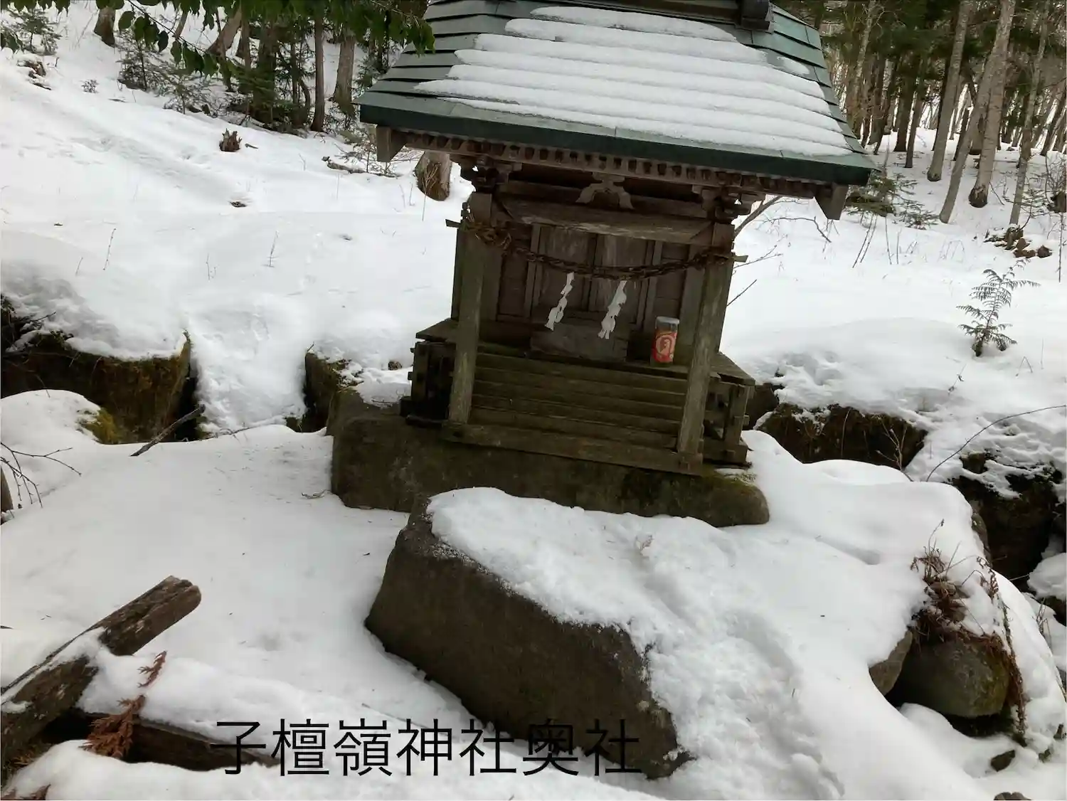 子檀嶺神社に1月19日に奉拝し、先に御朱印を頂いた子檀倉宮(子檀嶺神社奥宮)に、神社巡りの先輩と一緒に本日奉拝しました。今冬は雪が少なくて里は日影に少し残雪がある程度なのですが、奥宮に登る道路は一変して冬景色の真只中でした。15〜20センチの残雪に足が埋もれながらのお参りに、凛とした寒さの中、心も身体も清められた気持ちになりました。