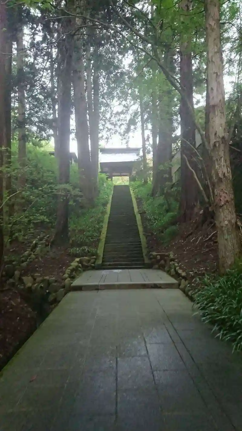 安楽寺の階段から山門を望むと杉に囲まれて清らかな感じになります。