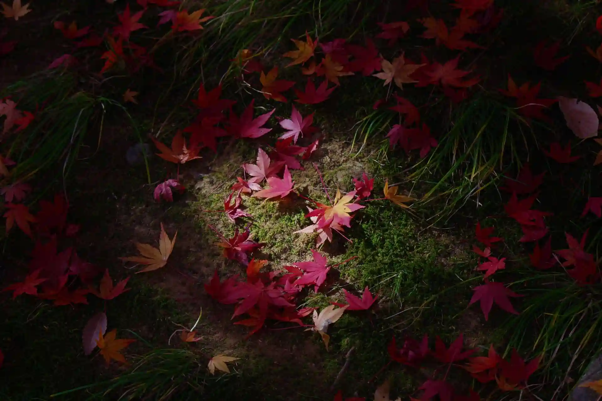 なんとなくハート型に光が当たった紅葉の落ち葉です。