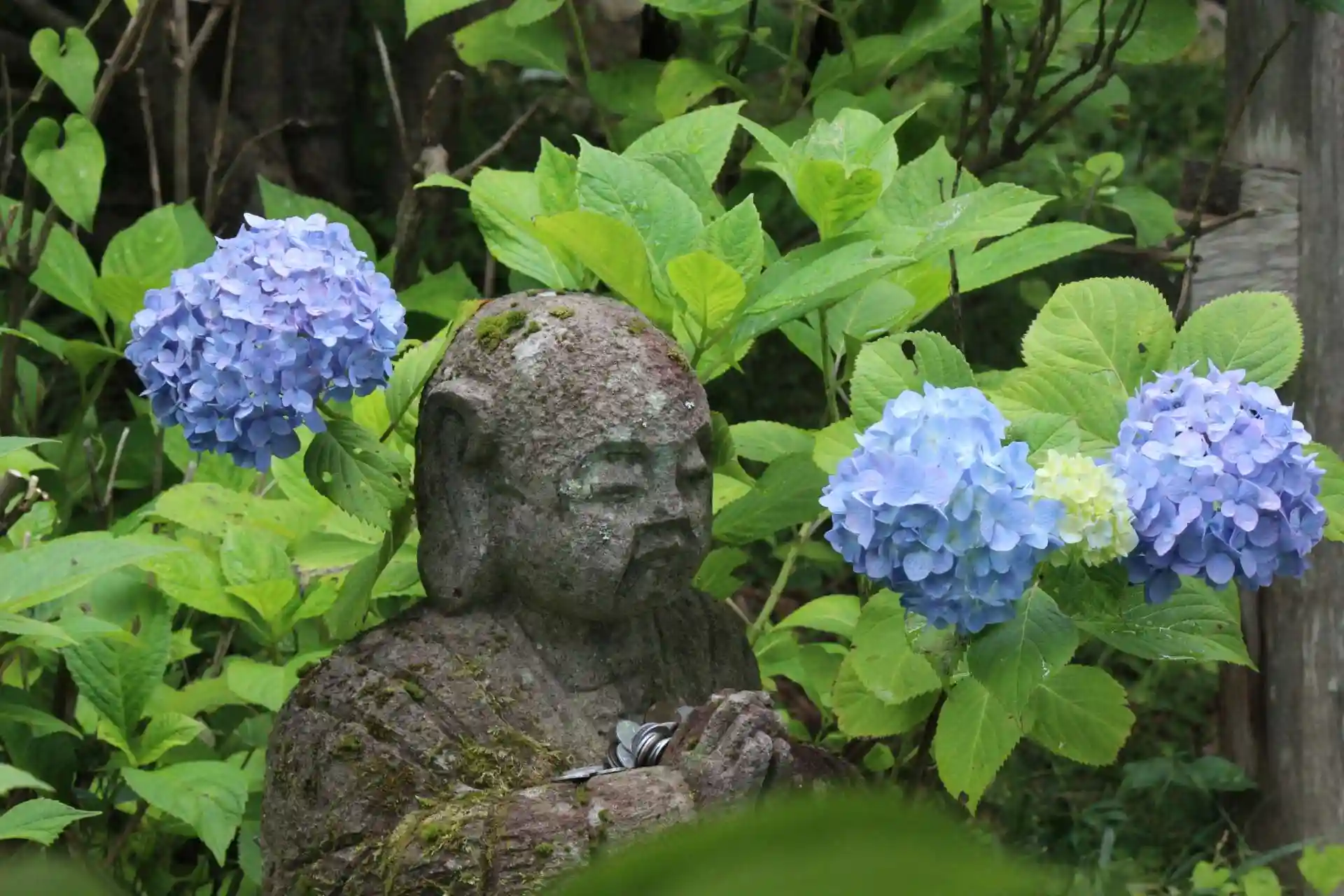 大法寺の紫陽花は、三重塔裏、羅漢石像周辺等の日差しの弱いところで、大変美しく咲いております。これから色づく花もあります。