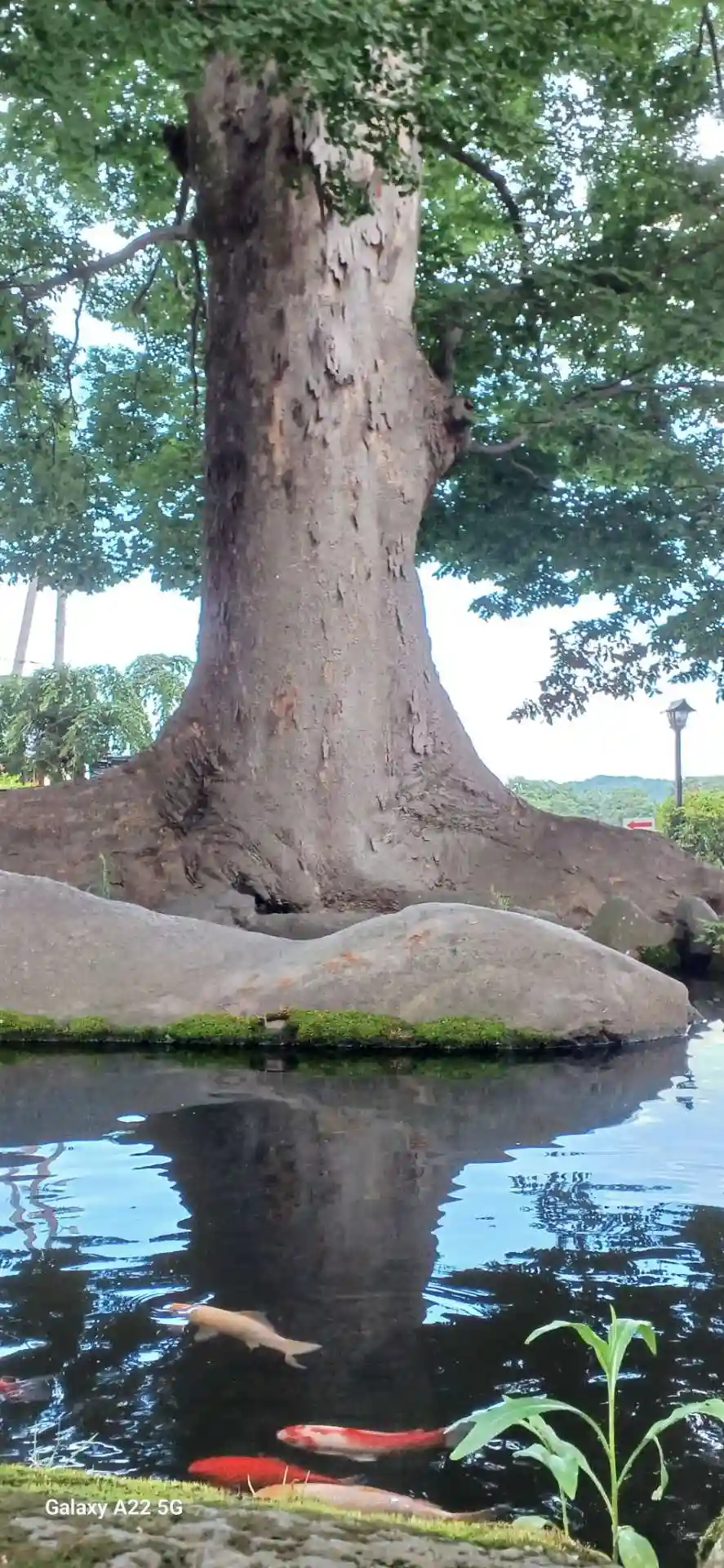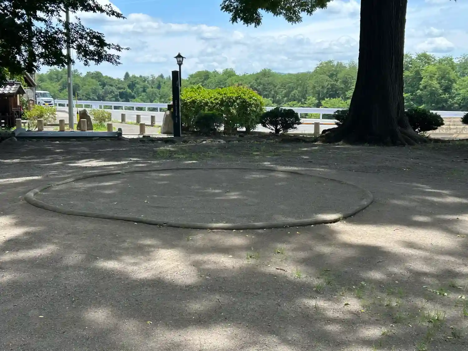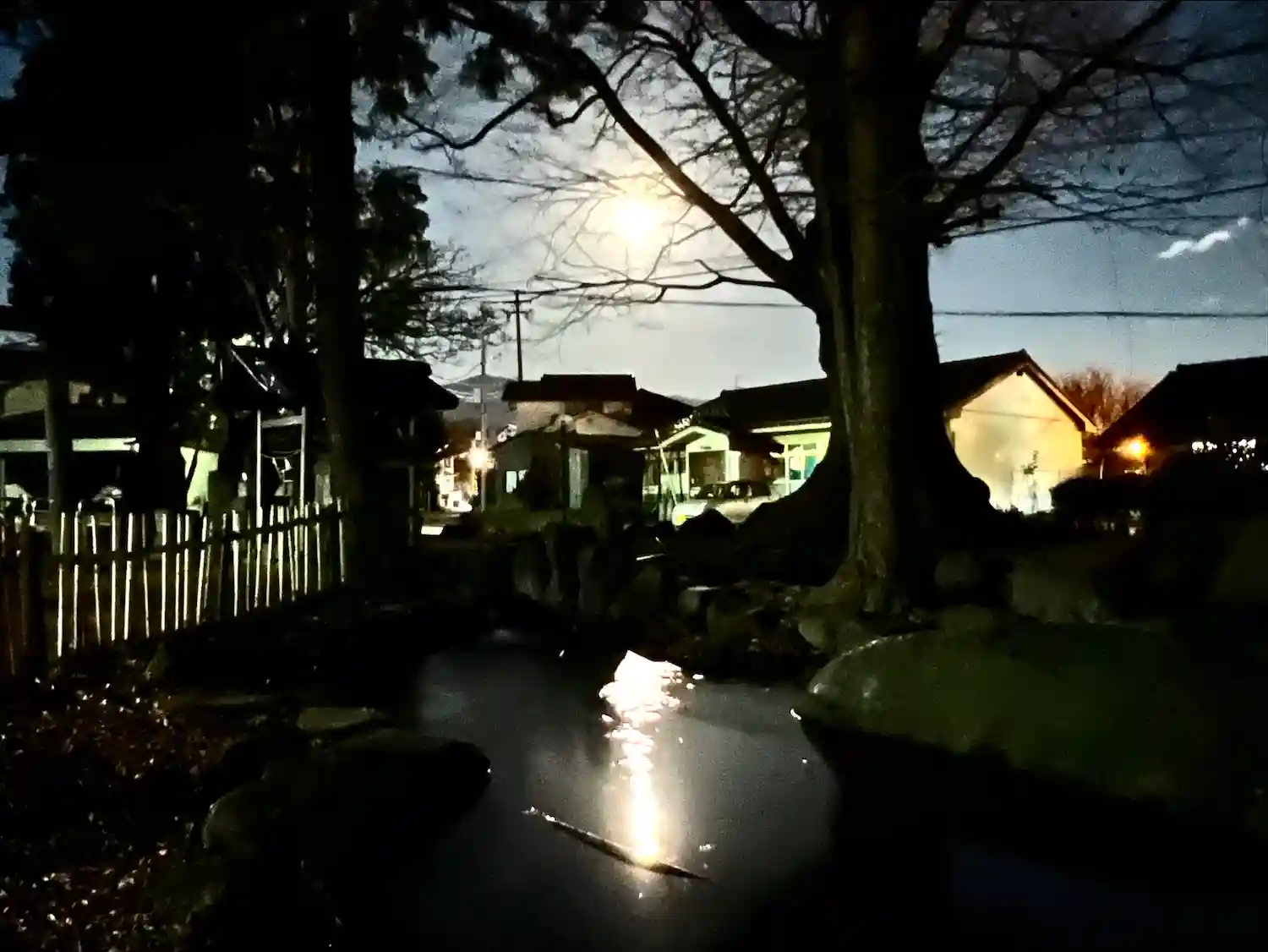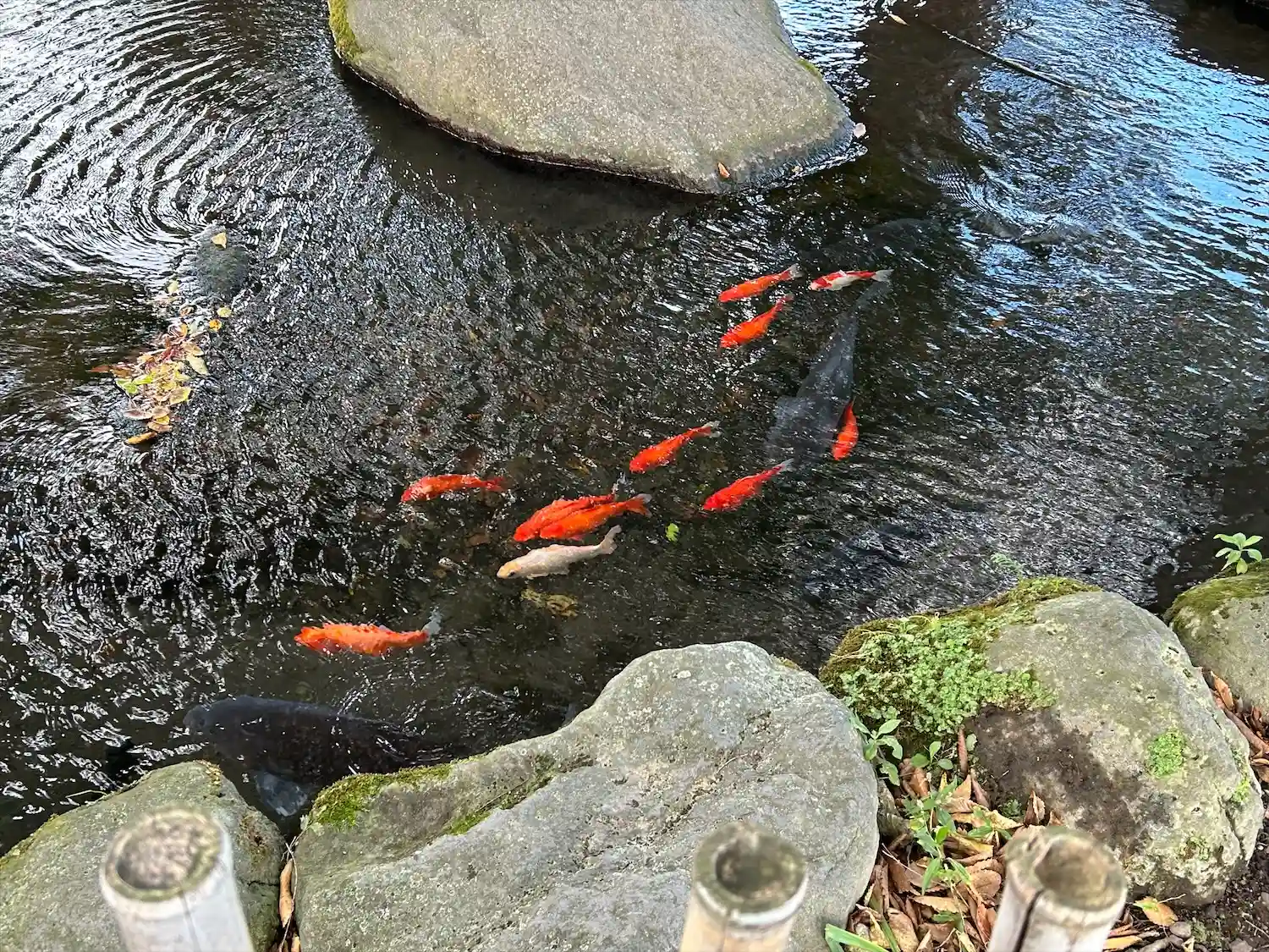 境内の木々が映った水面が