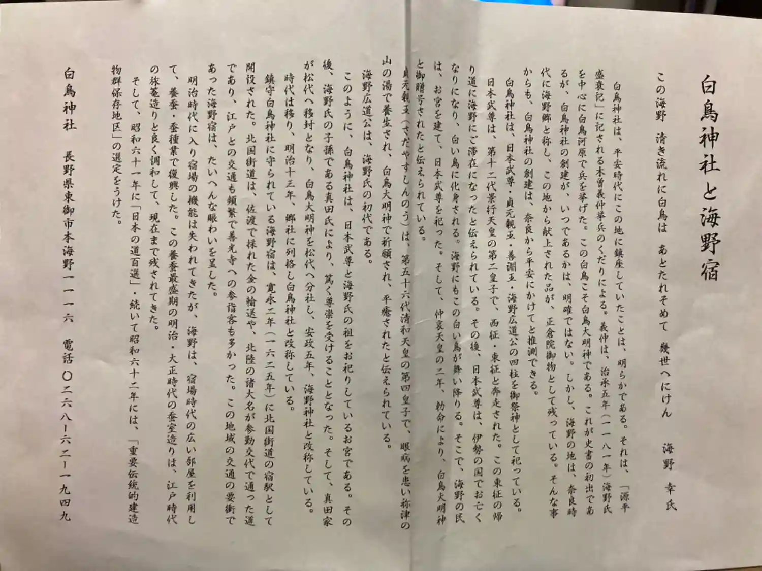 鎮守白鳥神社に守られている海野宿は、寛永二年(1625)に開設。佐渡で採れた金の輸送や、北陸の諸大名が参勤交代で通った道であり江戸との交通も頻繁で、善光寺への参詣客も多かった。この地域の交通の要衝であり、大変な賑わいだったらしいです。