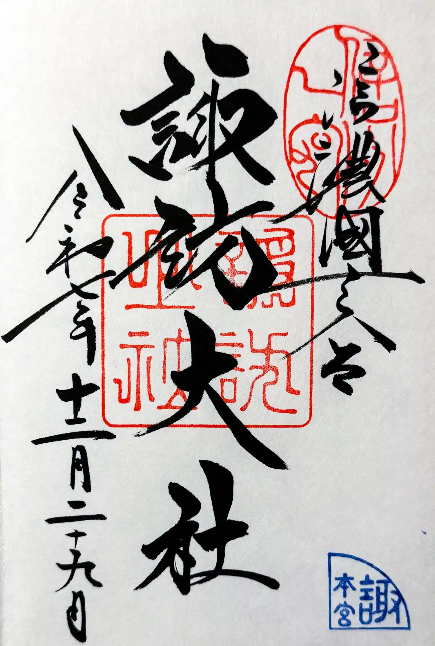 | 御朱印 | あり 右に信濃國之一宮、真ん中に諏訪大社、左に上社本宮と書かれ、右上に信濃一宮の印、諏訪大社の社印が押された御朱印です。 |