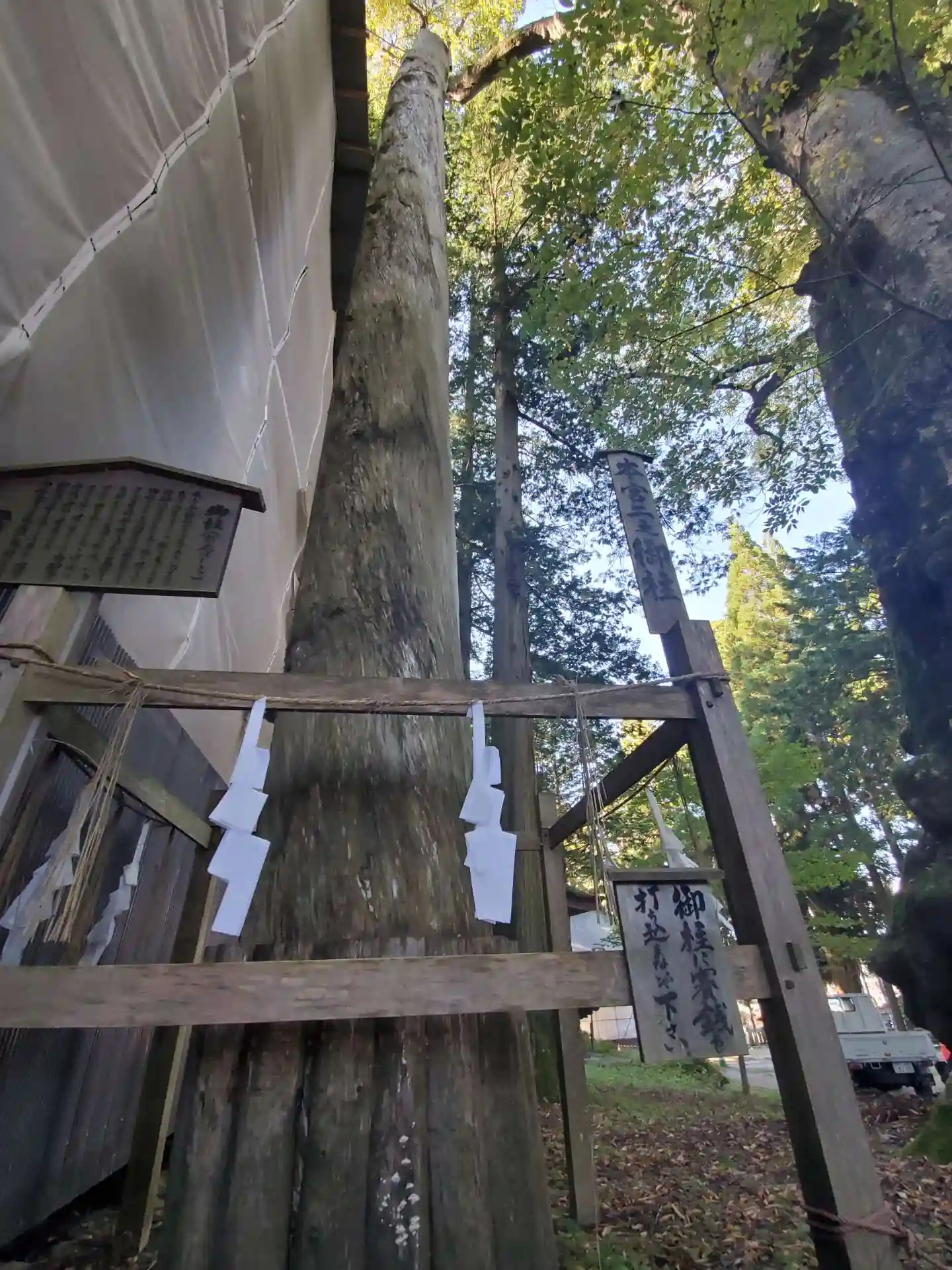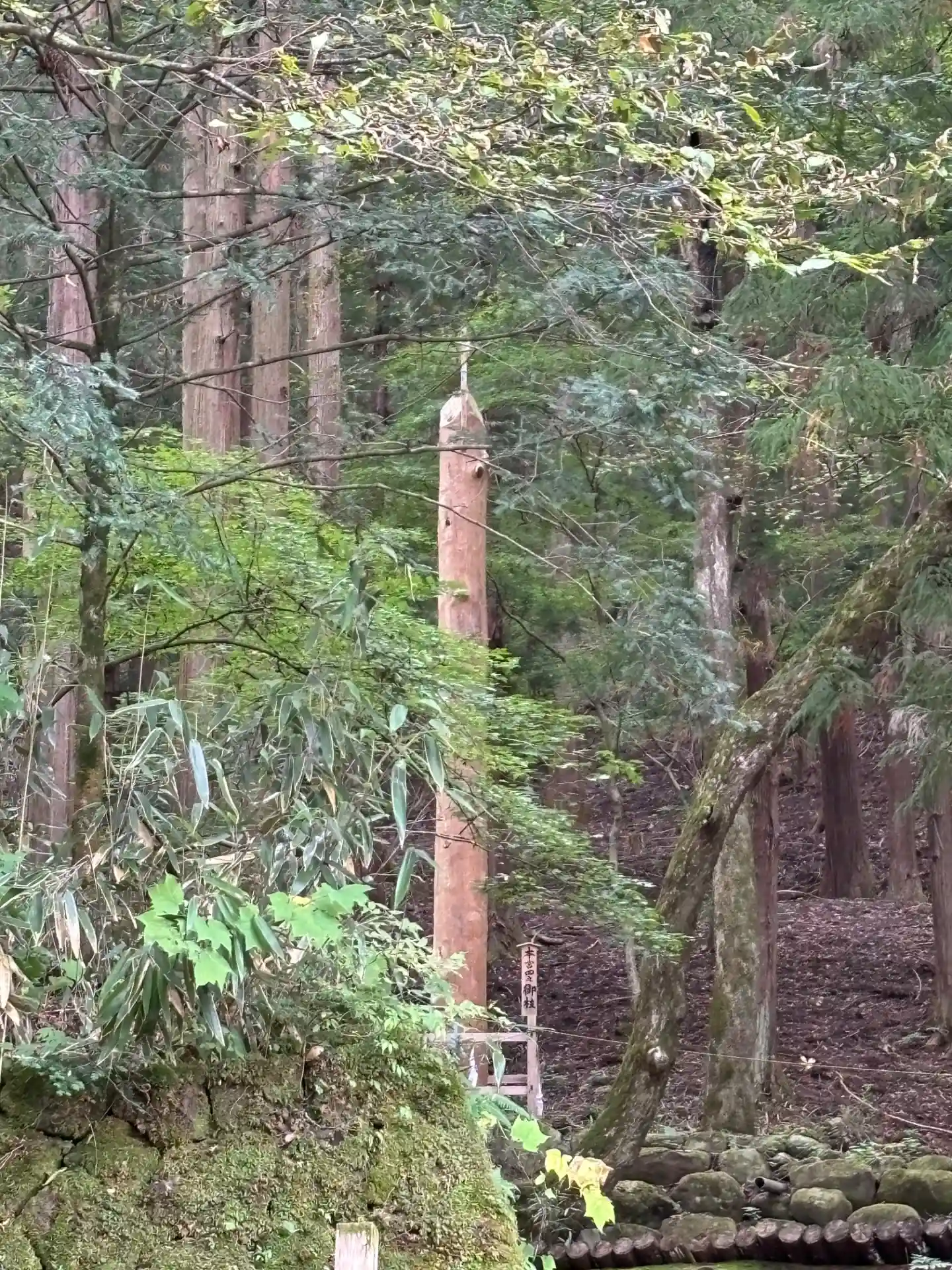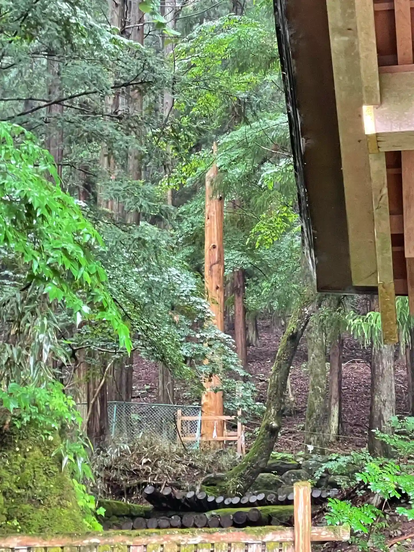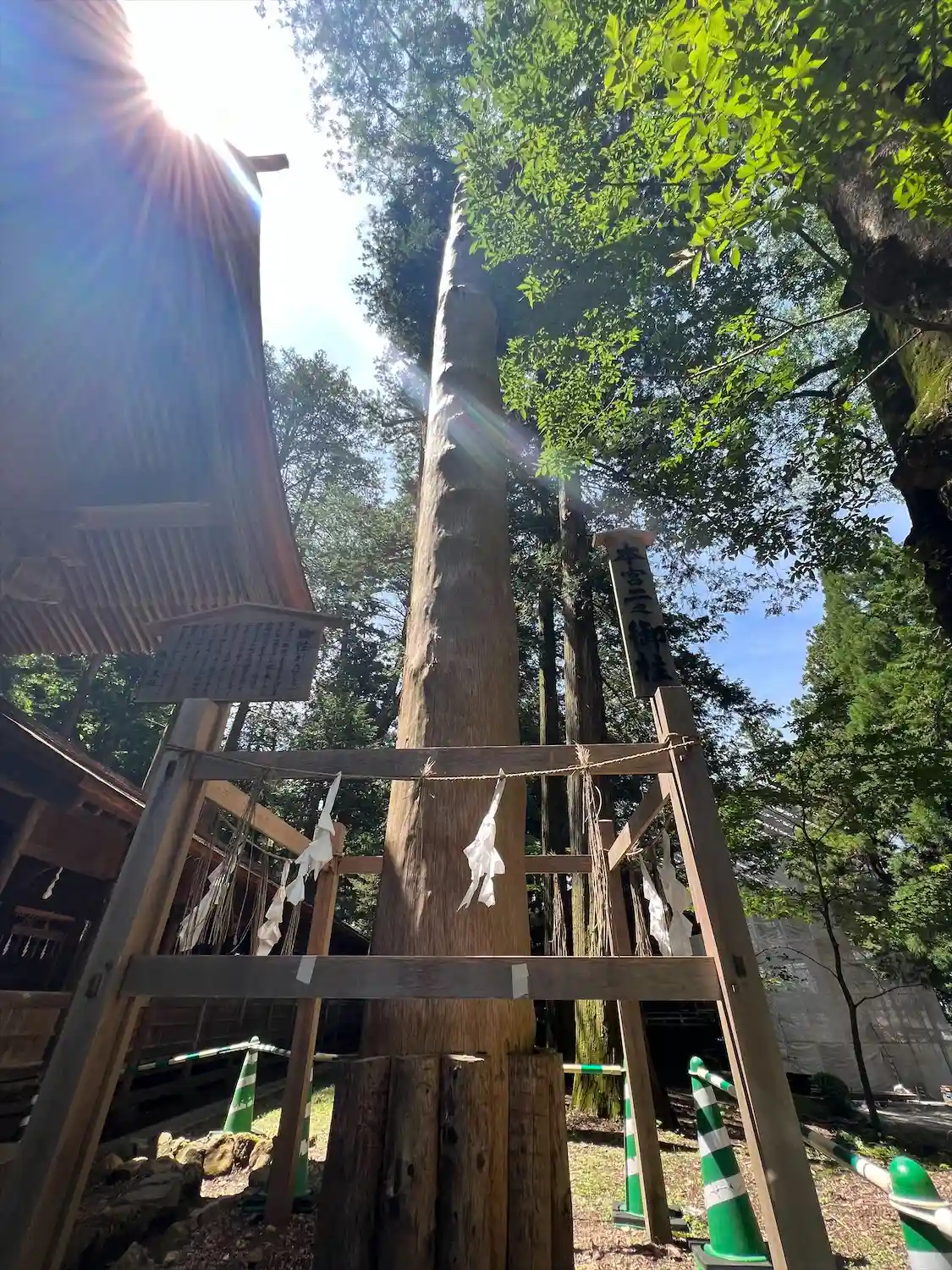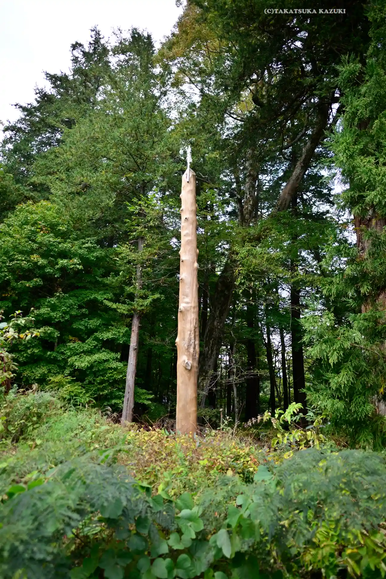 一の柱。樅(モミ)の木。ここから時計回りに神域を囲むように4本建てられる。