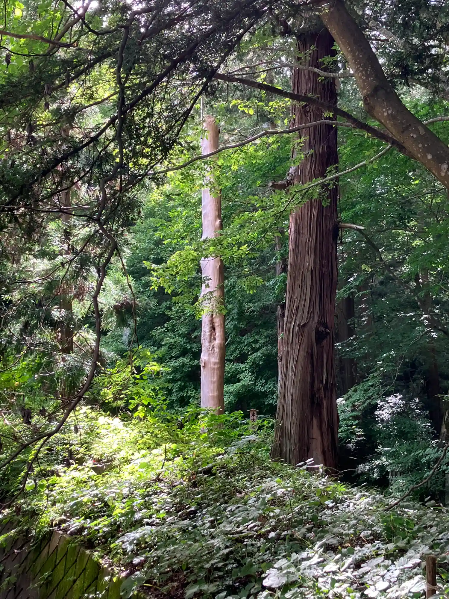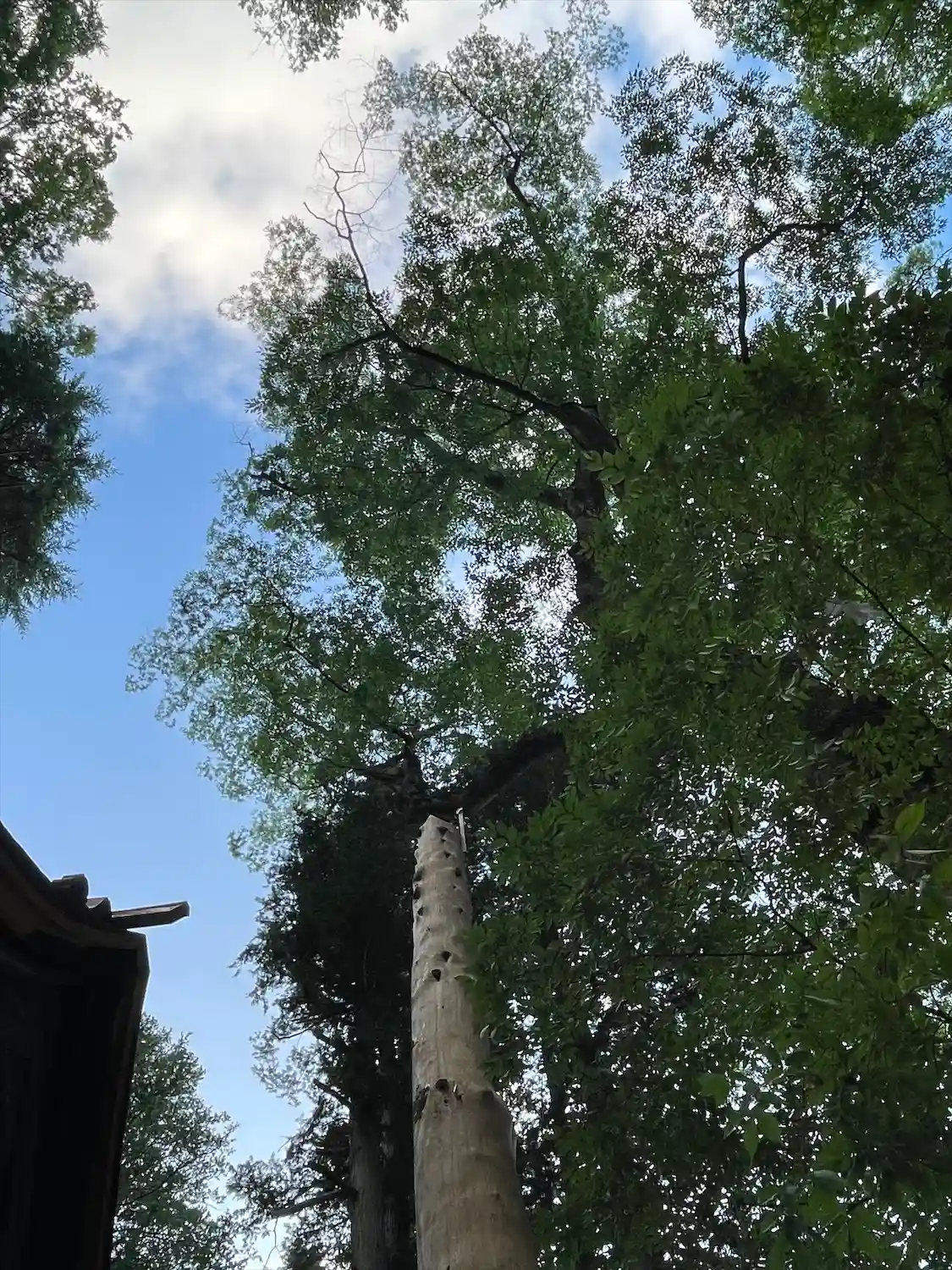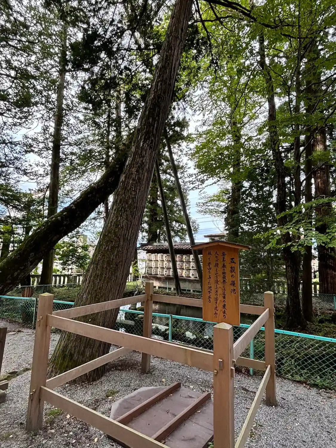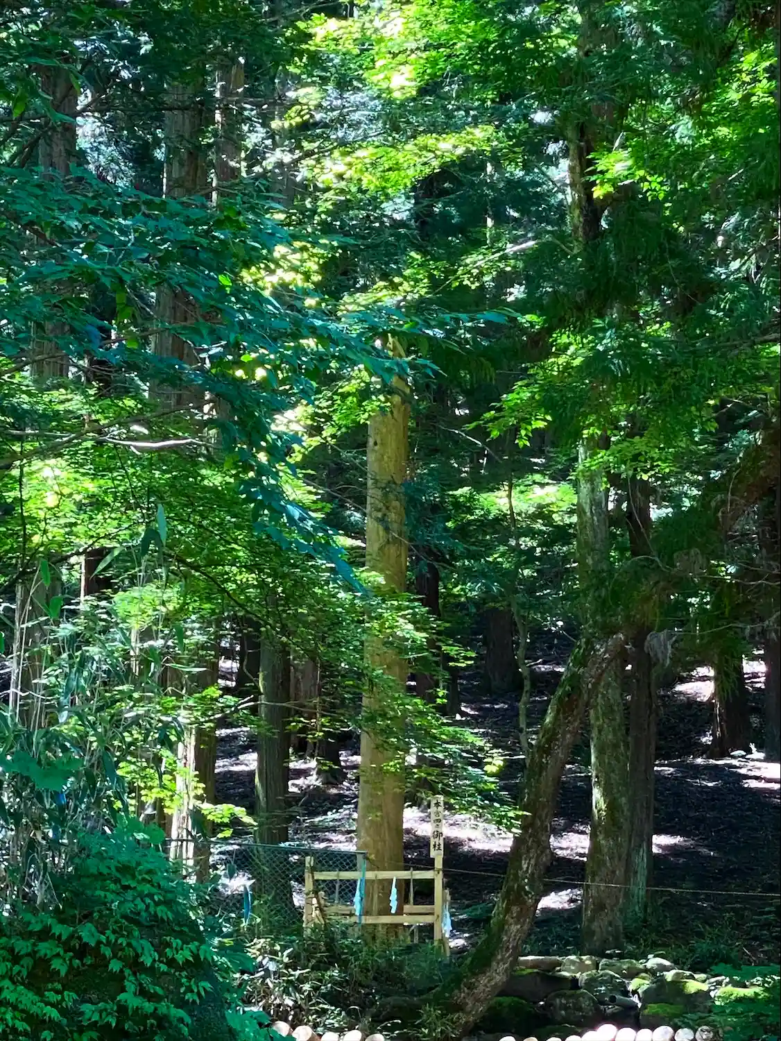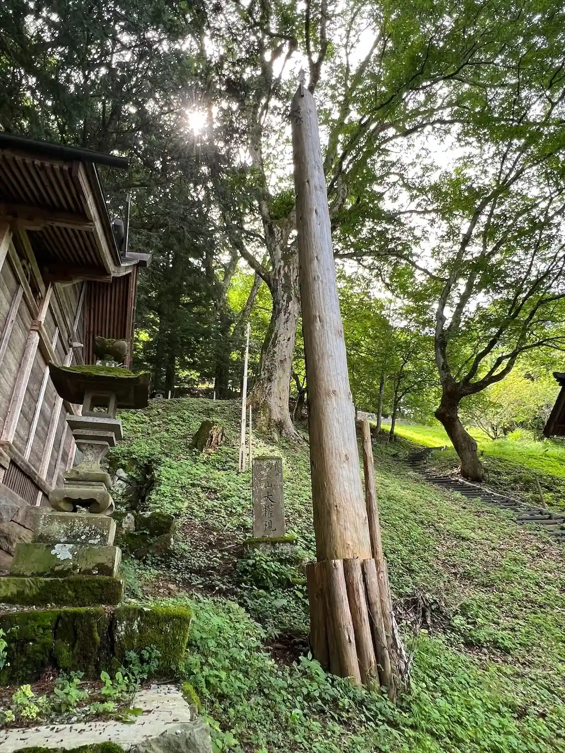 一の柱。樅(モミ)の木。ここから時計回りに神域を囲むように4本建てられる。