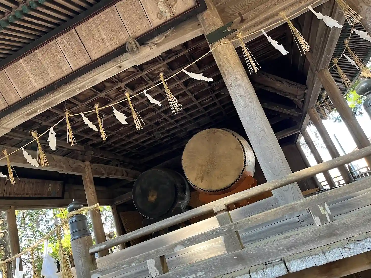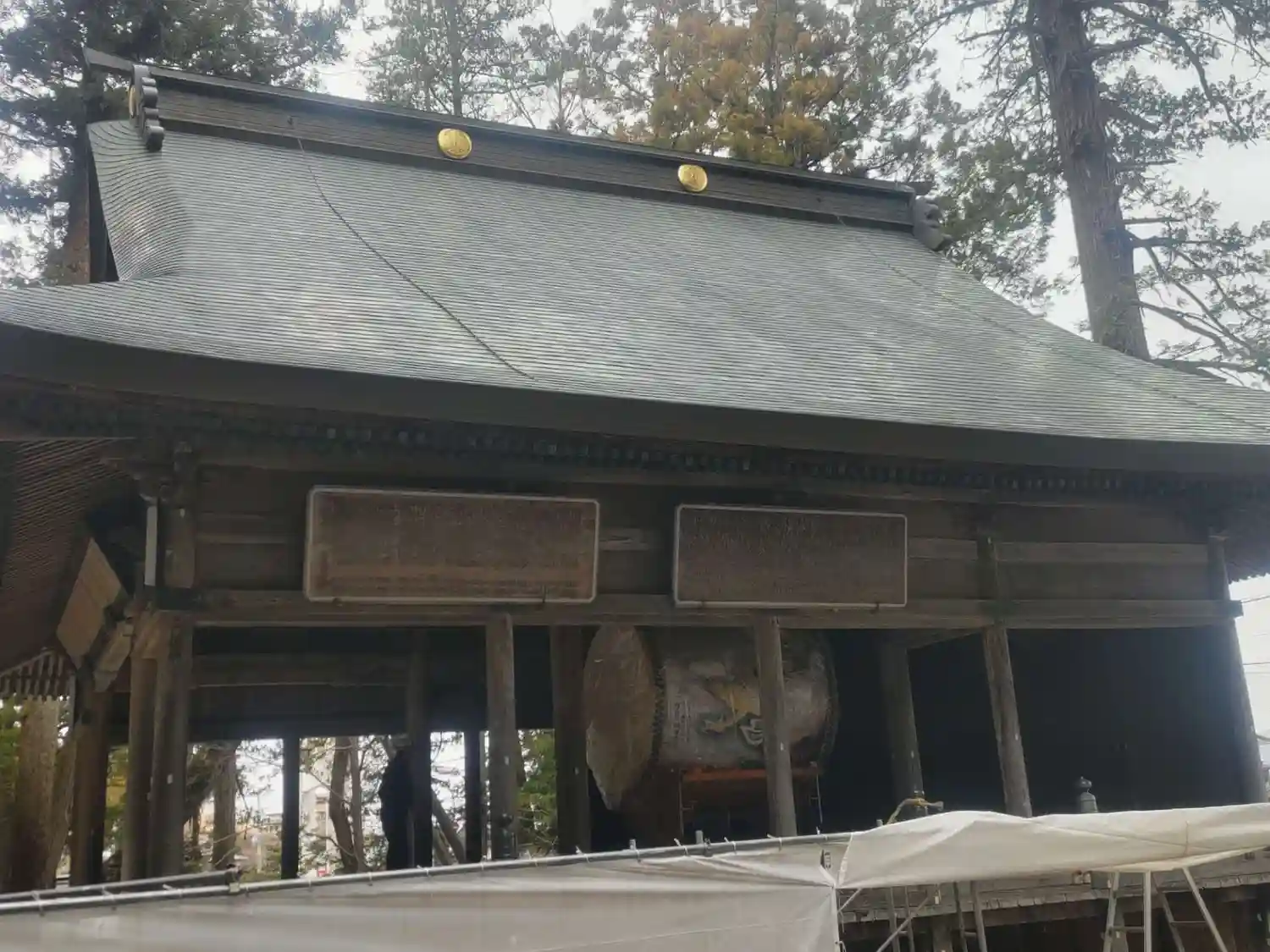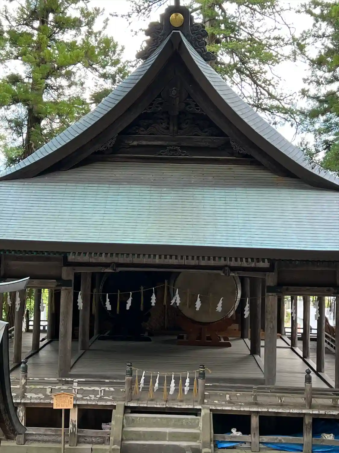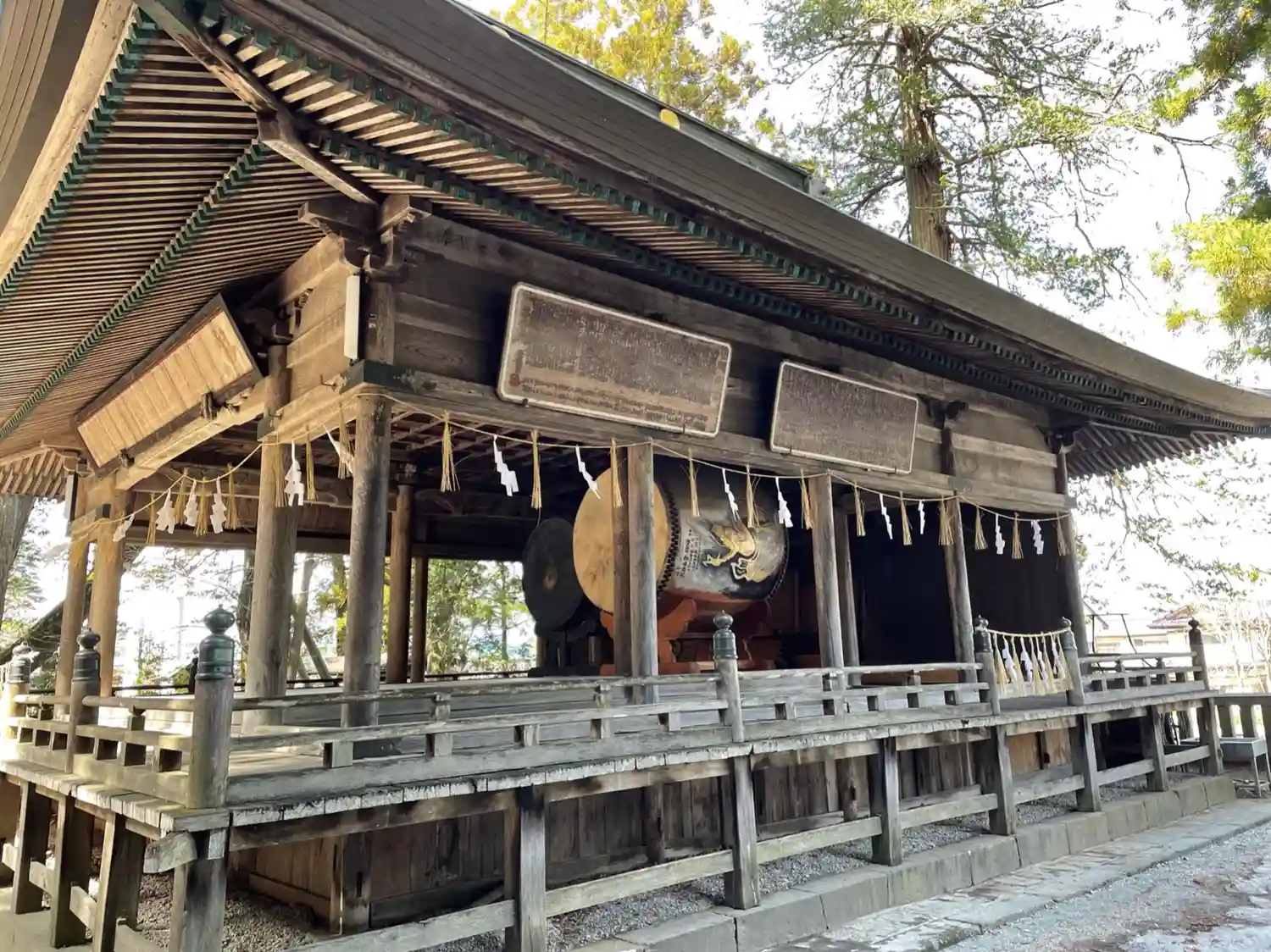 神楽殿。国重要文化財。中には巨大な大太鼓があり元旦の朝にのみ打たれます。皮は牛の一枚皮が使われ、一枚皮としては日本一の大きさだそうです。そんなデカい牛がいるのかと驚きます。