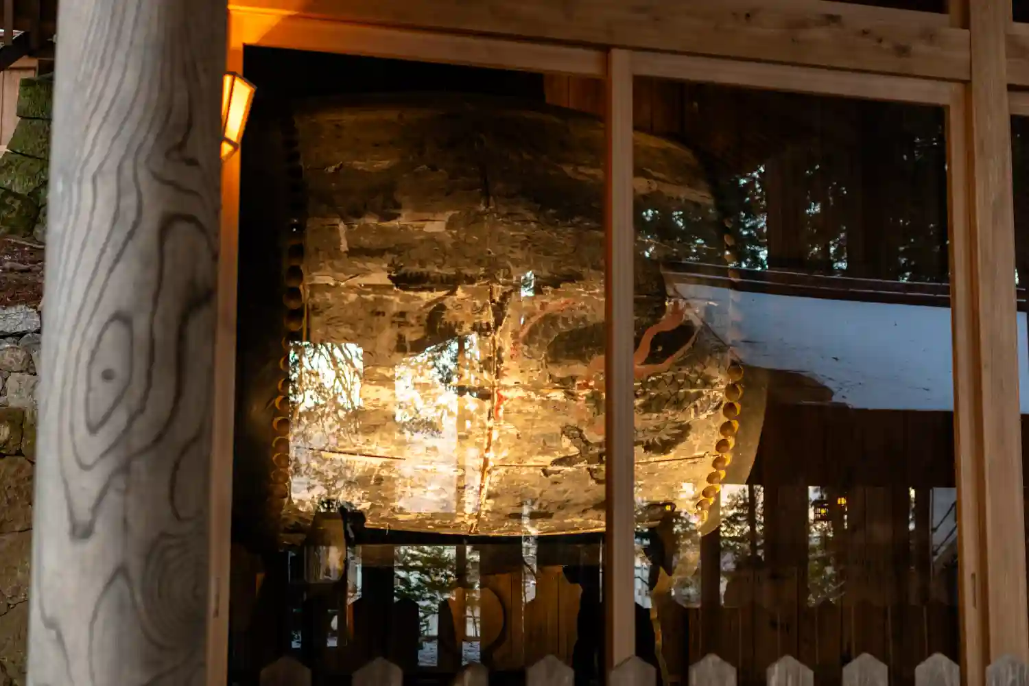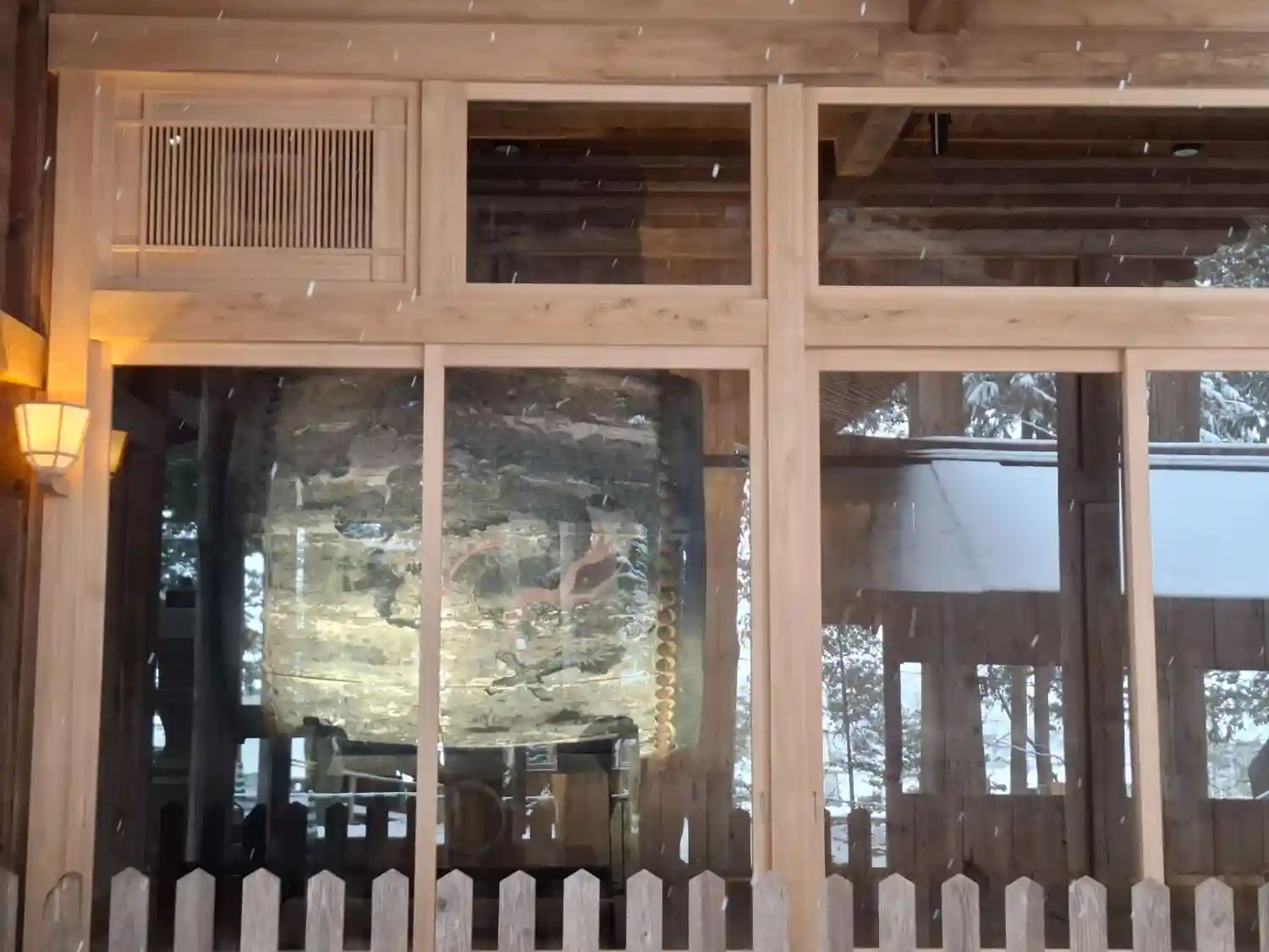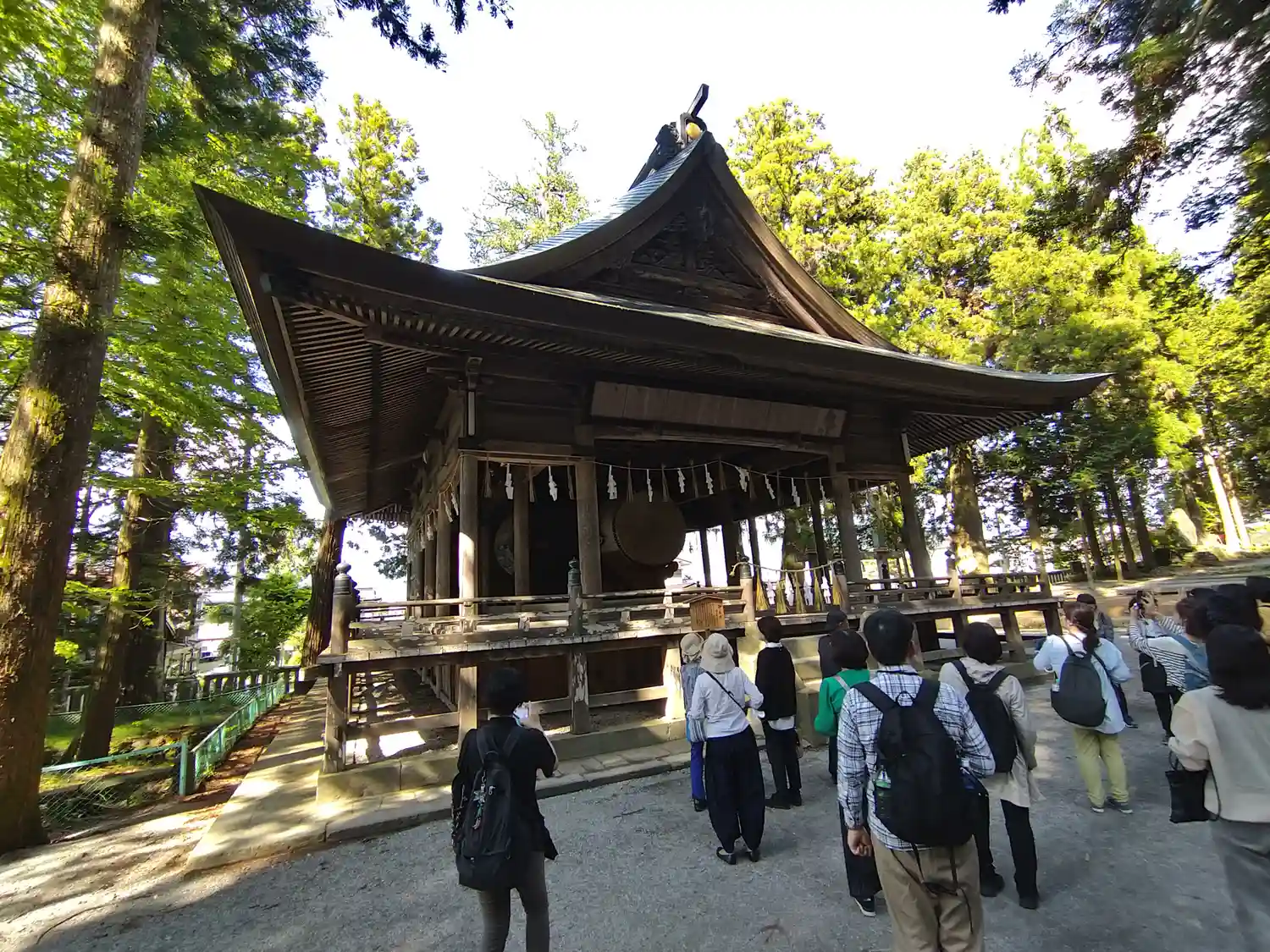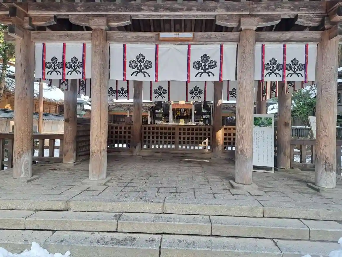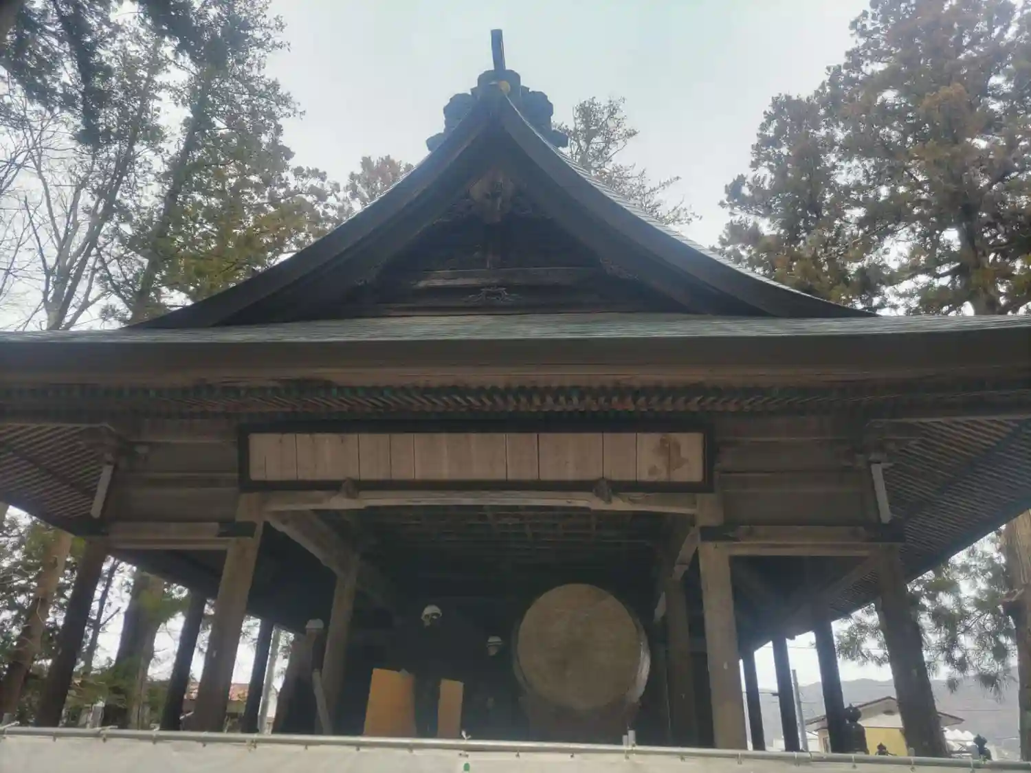 神楽殿。国重要文化財。中には巨大な大太鼓があり元旦の朝にのみ打たれます。皮は牛の一枚皮が使われ、一枚皮としては日本一の大きさだそうです。そんなデカい牛がいるのかと驚きます。