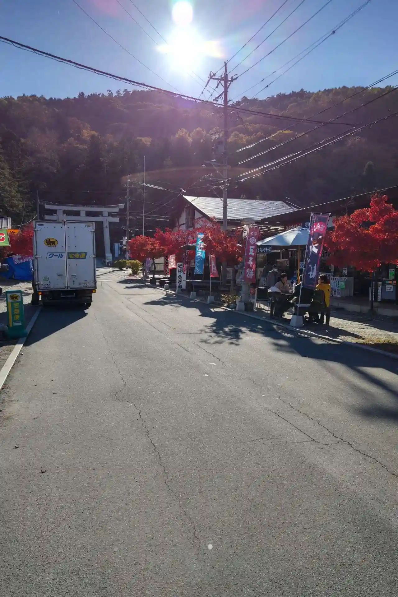 正面鳥居の前には土産屋が軒を連ねます。ところてんが名物なのか、店の人が熱心にアピールしていました。