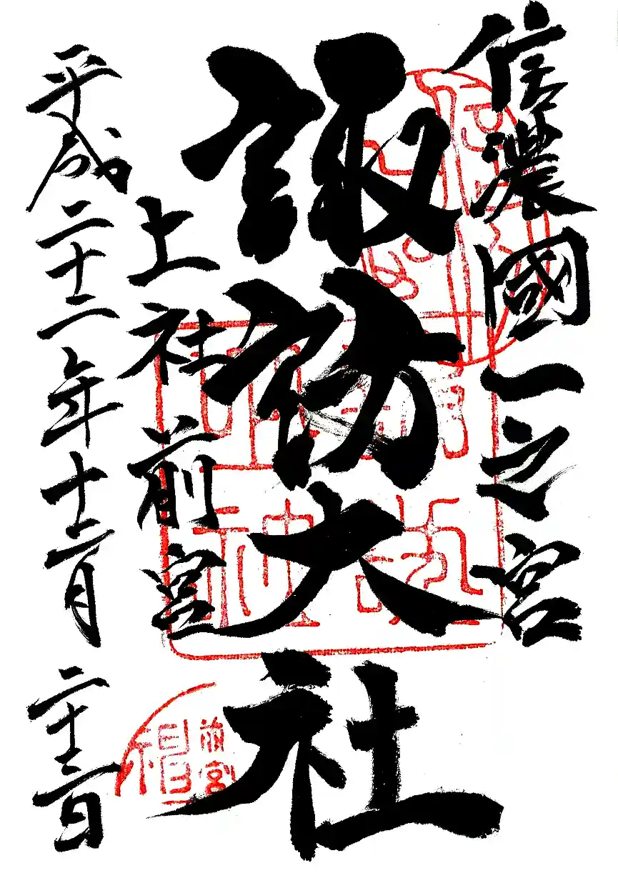 | 御朱印 | あり 右に信濃國一之宮、真ん中に諏訪大社、左に上社前宮と書かれ、右上に信濃一宮の印、諏訪大社の社印が押された御朱印です。 |