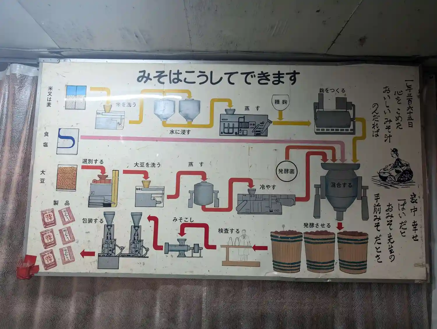 扉を開けて入ると信州味噌を売っている売店なのですが、奥に見学できる味噌工場があります。そのまま入るのもあれなので、一番人気という吟醸味噌を購入してから奥に入る。