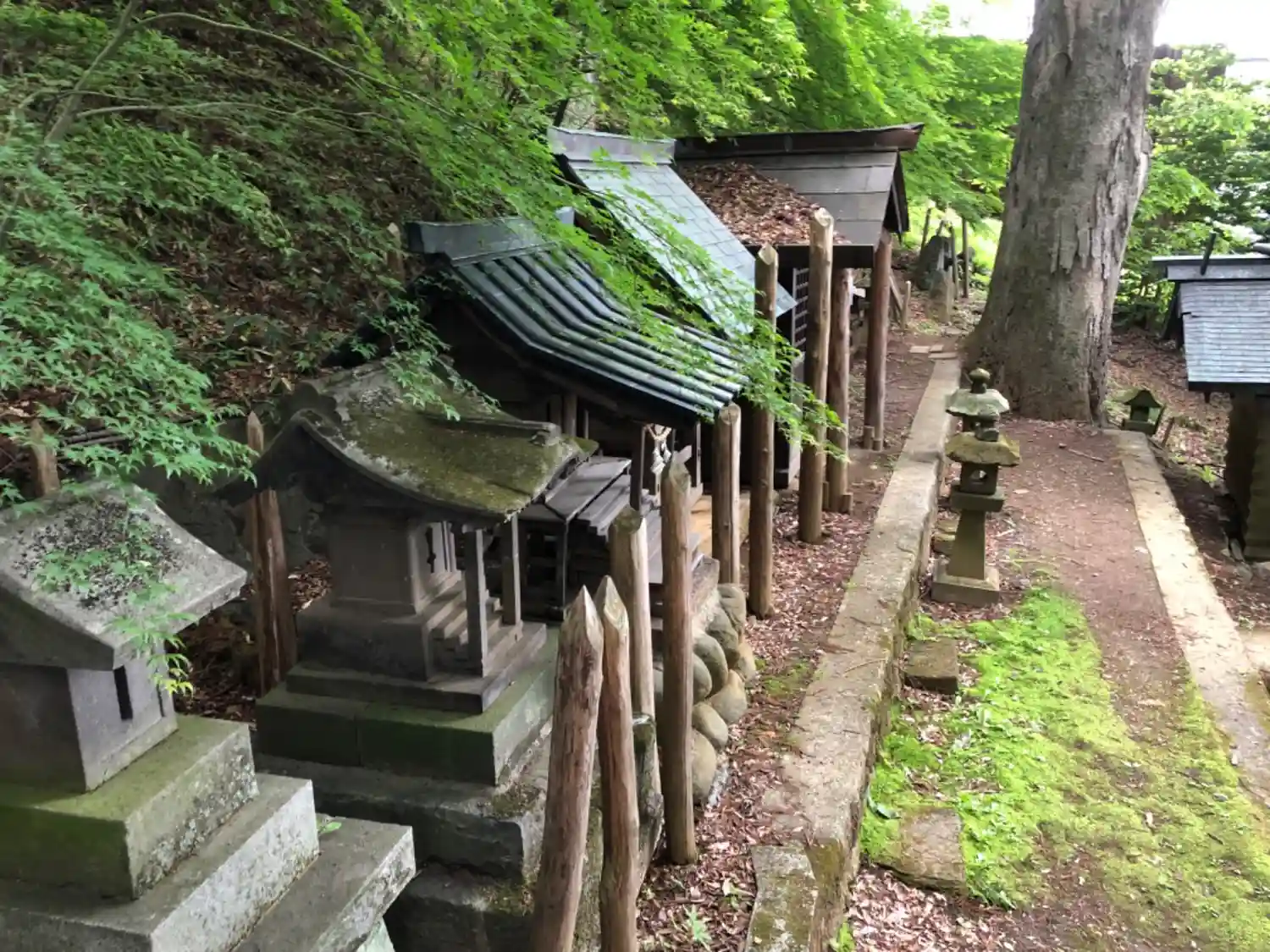 《末社群》 末社にも細かくミニ御柱が立てられていますね。