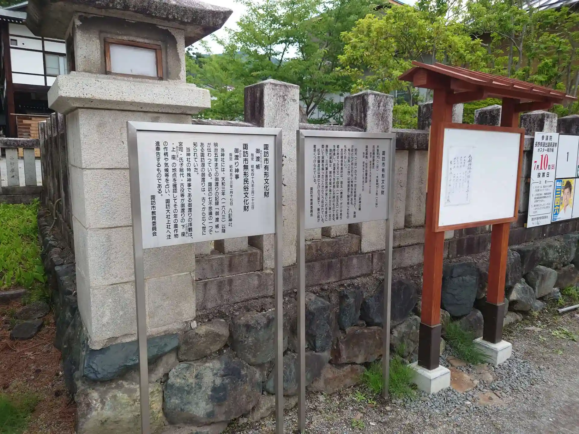 甲斐、諏訪神社巡り②足長神社より麓の方に下り、街中に鎮座する諏訪大社上社の境外摂社です。元々は現在の高島城址に鎮座していましたが、豊臣秀吉が高島錠を築城するにあたって現在地に遷座したものです。こちらの神社では御渡神事という特殊神事が行われ、諏訪湖に御渡りを観測布告記録をしています。鳥居前の温泉手水も嬉しかったですが、なかなか見どころの多い神社でけ、境内社の一つに諏訪地方に多くみられる御社宮司社という先住神を祀っていることに興味を惹かれました。社務所で宮司様より大変興味深いお話も伺え、先の足長神社と合わせて御朱印を書き入れていただきました。