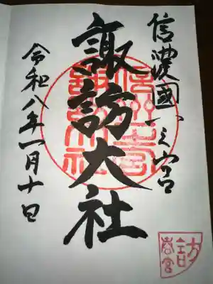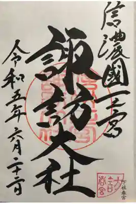 右に信濃國一之宮、真ん中に諏訪大社、左に下社春宮と書かれ、右上に信濃一宮の印、諏訪大社の社印が押された御朱印です。 | |||